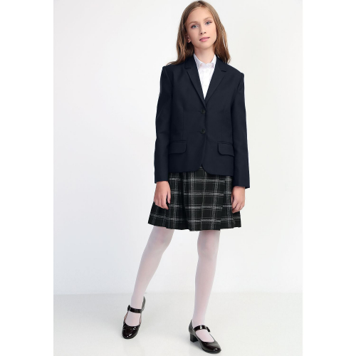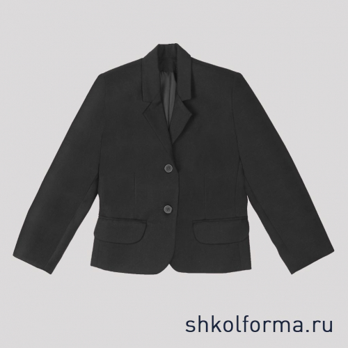 Пиджак для девочки черный, классический, однобортный,  с воротником, с лацканами и прорезными карманами,  на подкладке. Рукав двухшовный. Застежка обметанной петлей на пуговицы.  Производство — Россия, Москва.
