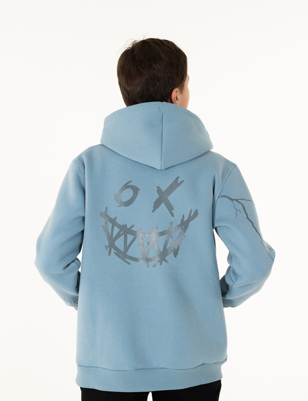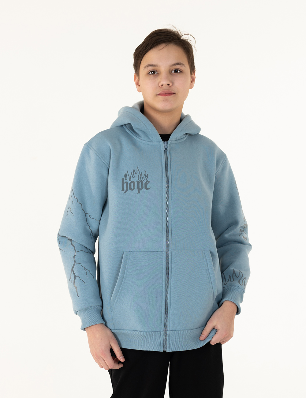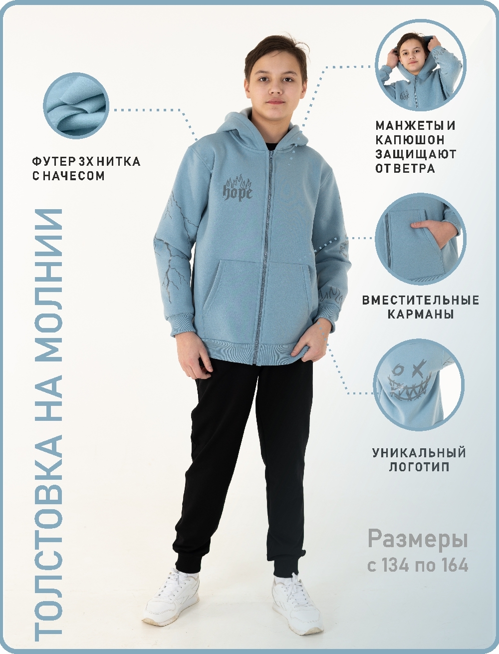 Базовая толстовка для мальчиков и девочек из футера трёх нитки с начёсом. Глубокий капюшон защищает от ветра и холода. В холодное время года можно спрятать руки во вместительном кармане кунгуру. Наличие молнии на толстовке позволяет её использовать как ветровку в демисезон - это очень удобно и тепло! Изделия из футера с начёсом очень мягкие и уютные. Но при этом не стоит забывать, что ДО первой носки толстовку рекомендуется постирать - начес может оставлять ворс на одежде. Это нормально для футера, не оставляет ворс только синтетическая ткань. Цвет: серо-голубой; Материал: футер 3-х нитка с начесом;футер 3-х нитка с начесом; Состав: 70% хлопок, 30% полиэстер.