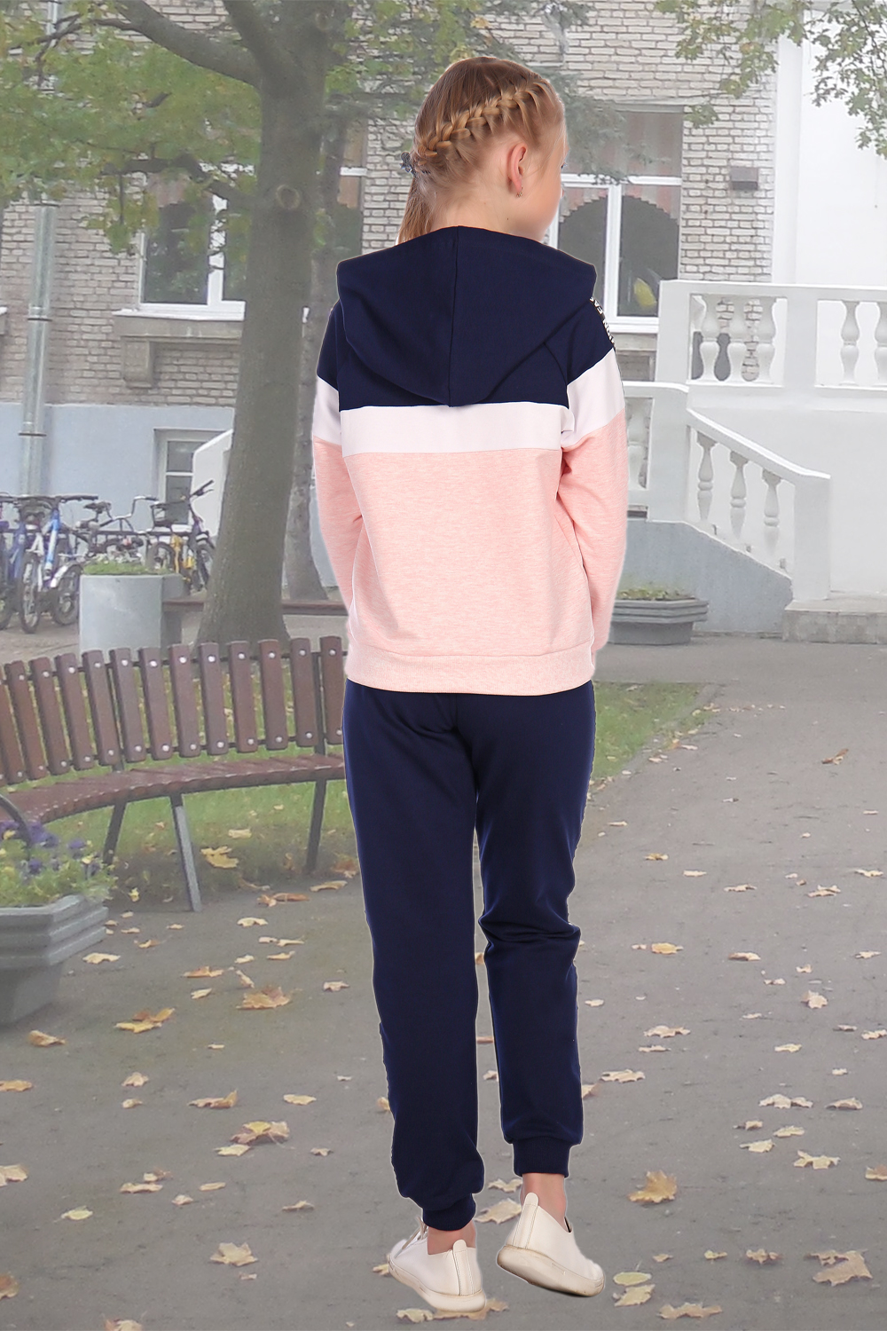 Подростковый спортивный костюм. Свободны брюки на манжете. Кофта средней длины, капюшон регулируется шнурком. Для отделки используется лента с надписью. Цвет: розовый; Материал: футер 2-х нитка;футер 2-х нитка; Состав: 70% хлопок, 24% п/э, 6% лайкра.