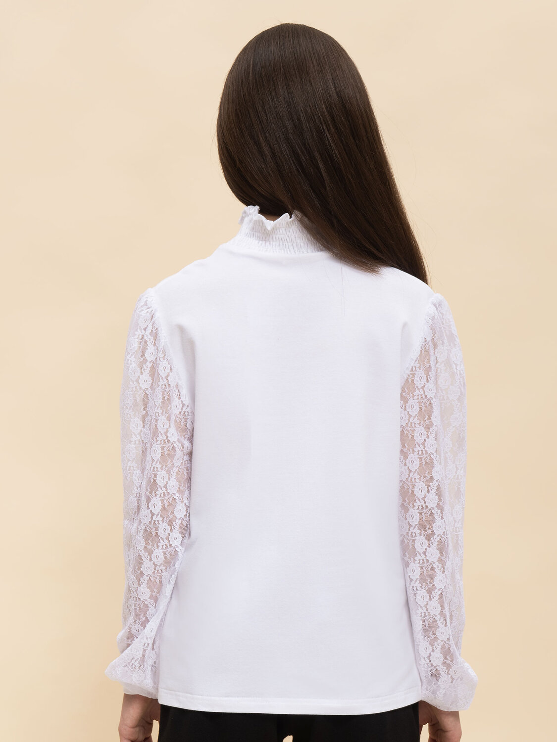 Школьная блузка с кружевными рукавами для девочки. Комфортная и мягкая трикотажная блузка умеренного объёма хорошо садится на девочек с разной фигурой и не сковывает движений ребёнка. Рукава выполнены из оригинального кружевного эластичного полотна с нежным девичьим узором. По низу рукавов узкие манжеты из основного материала для удобства в носке. Блузка дополнена воротником-стойкой с эластичной сборкой — удобно надевать и при этом элегантно смотрится. По переду модель декорирована небольшой деликатной сборкой. В составе ткани преобладает качественный хлопок — ребёнку не жарко, кожа дышит. Благодаря полиамиду блузка в школу для девочки хорошо сохраняет форму и первозданный внешний вид. Модель однотонная, без принта. В ассортименте представлены блузки для девочек школьные универсальных цветов. Они легко сочетаются с различными брюками, юбками, сарафанами. Блузка детская подходит как для повседневной носки в школу, так и для более торжественного случая — в зависимости от того, с чем её надеть. Отличный выбор школьной формы для вашей девочки. Помните о правильном уходе за изделием: рекомендуется стирать при температуре не выше 30 °C, без предварительного замачивания, с изнанки. Это поможет сохранить качество и цвет блузки на долгое время. Не забывайте о выборе правильного размера. Используйте таблицу размеров на фотографии, чтобы выбрать подходящий вариант. Обратите внимание, что цвет товара на экране вашего устройства может отличаться от реального.