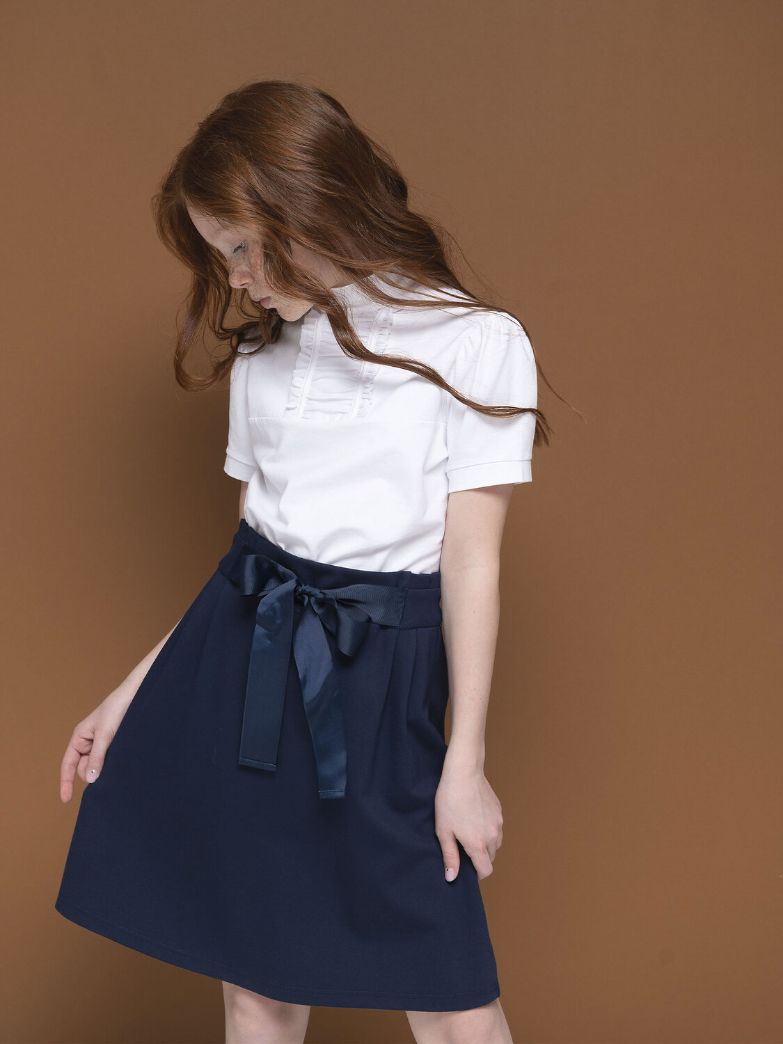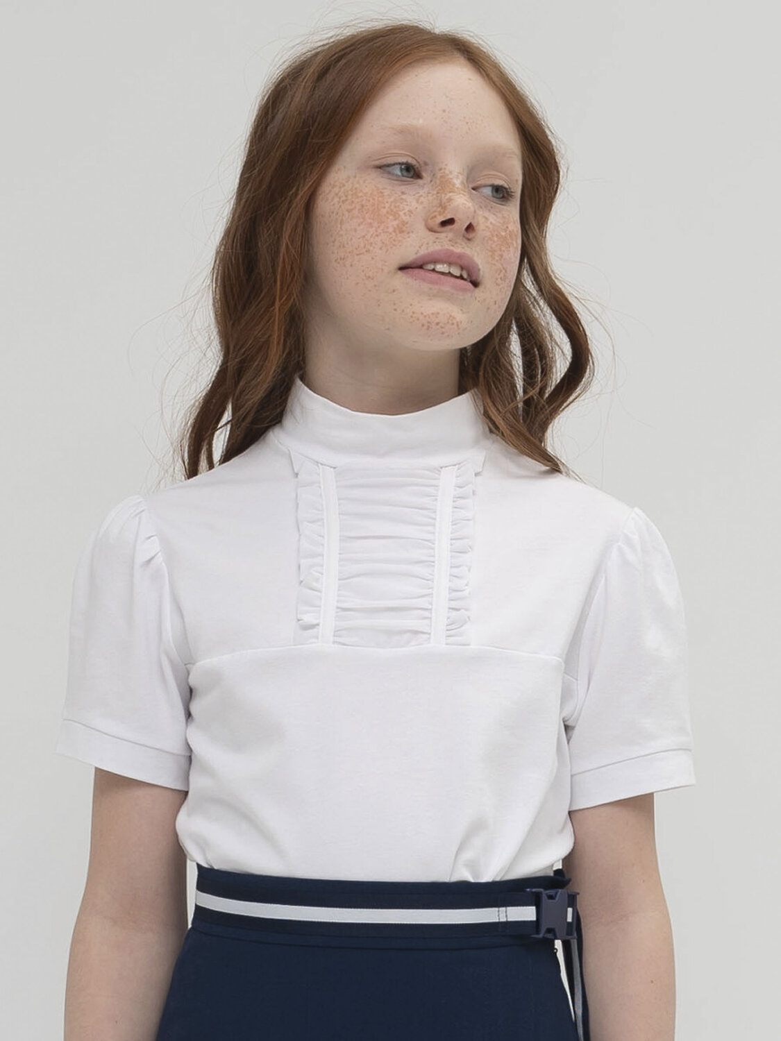 Школьная футболка для девочки в классическом стиле. Мягкая, но хорошо держит форму. В ней комфотно активно двигаться, ничего не будет тянуть. Необычная драпировка из мягкой сетки на кокетке и небольшая сборка рукава добавляют лёгкости в образ. Воротник стойка прилегает аккуратно и не давит. Практичная классика с учётом современных тенденций нужная вещь в школьном гардеробе и не только!