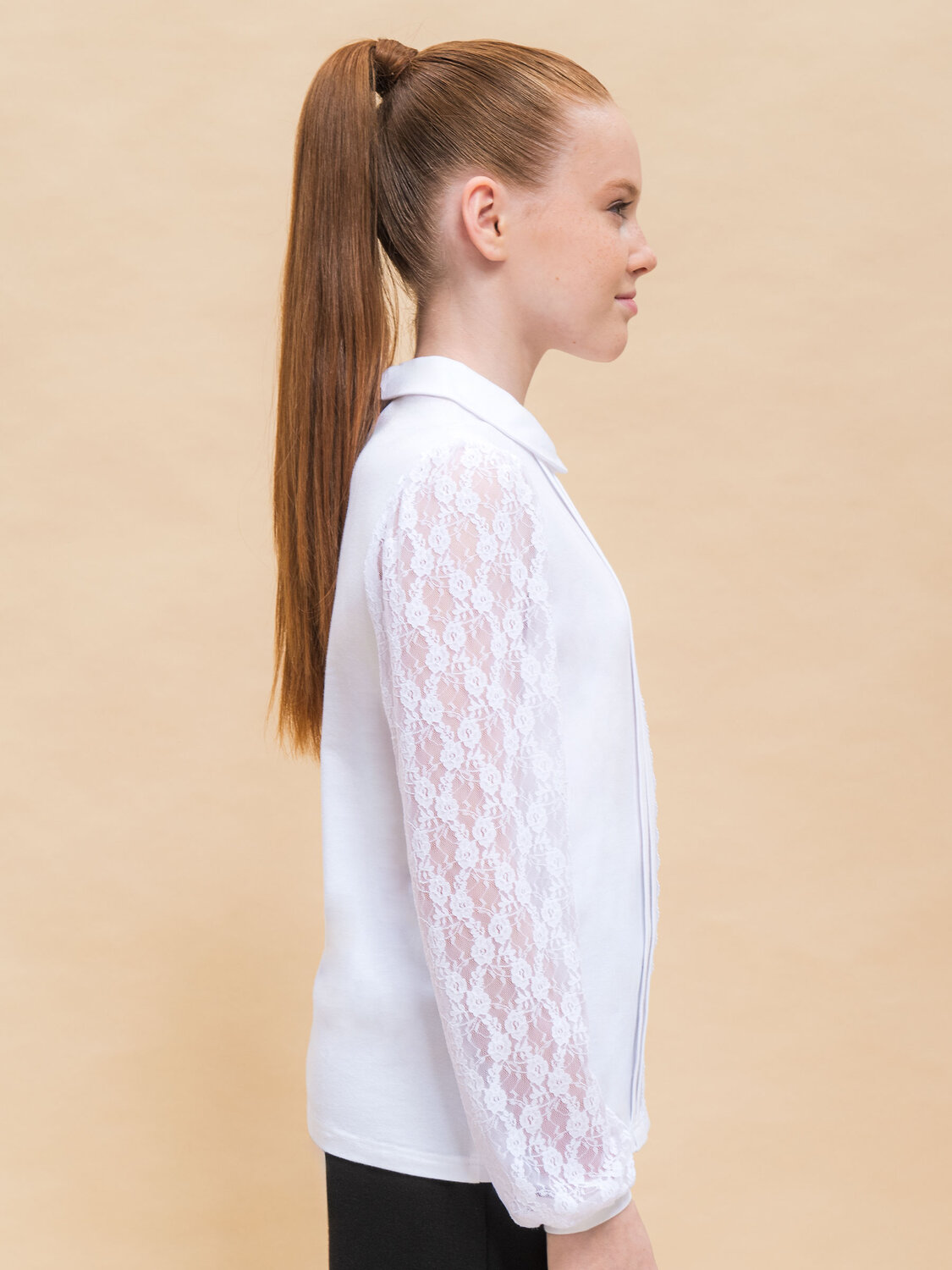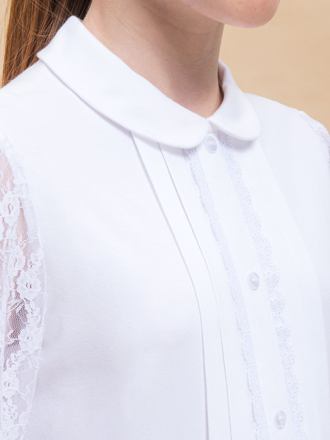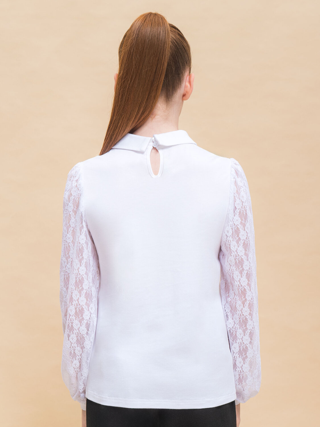 Джемпер с длинным рукавом из мягкого хлопкового трикотажа с небольшим содержанием эластана, полуприлегающего силуэта, с отложным круглым воротником на цельнокроеной стойке. По центру переда планка с декоративными пуговицами, вдоль которой застрочены вертикальные складки и кружево с фестонным краем. Рукава выполнены из кружевного эластичного полотна. По спинке застежка на две пуговицы.
