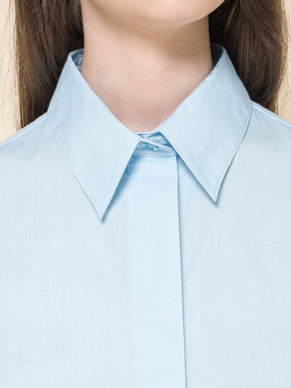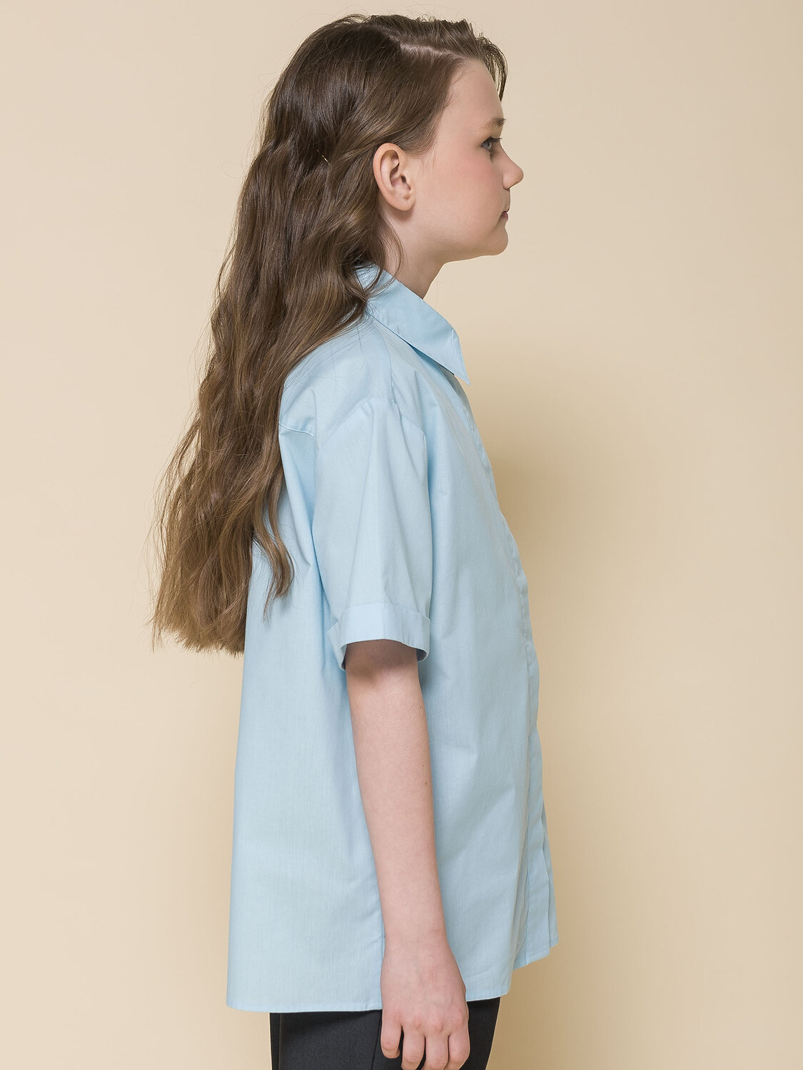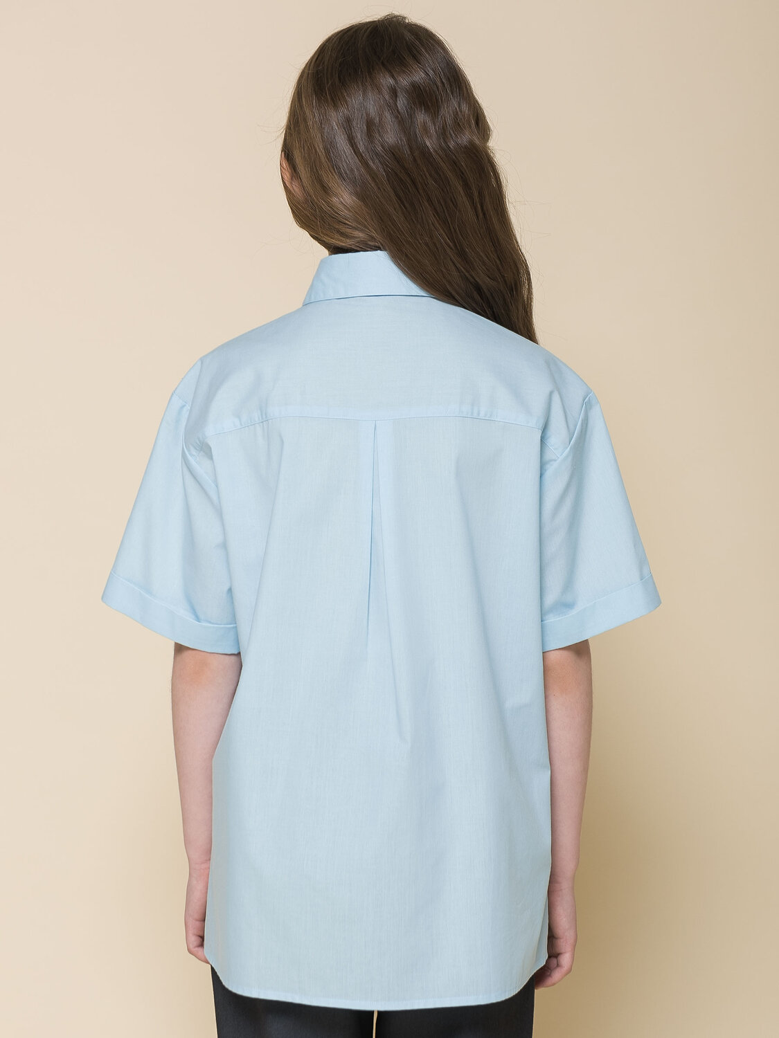 Школьная блузка прямого силуэта для девочки. Преобладающий в составе ткани хлопок делает эту модель мягкой, воздухопроницаемой и комфортной для ребёнка. Полиэстер помогает не терять форму и превосходный внешний вид. На спинке кокетка с защипом — свобода движения, комфорт в течение всего дня. Классическая центральная застёжка на пуговицы скрыта планкой — это придаёт блузке элегантной строгости. Рукав с отворотом - оригинально. Изделие лаконичного дизайна легко сочетать с различными брюками, юбками и джинсами. Красивая и практичная блузка — подходит как для повседневной носки в школу, так и для более торжественных случаев.