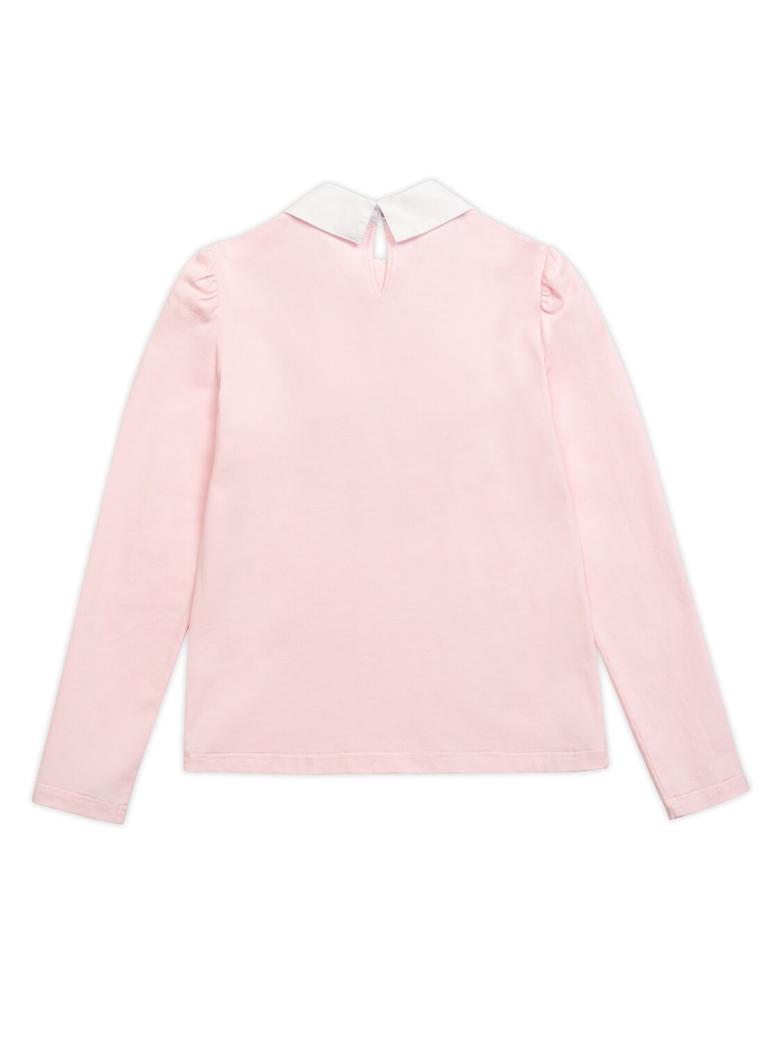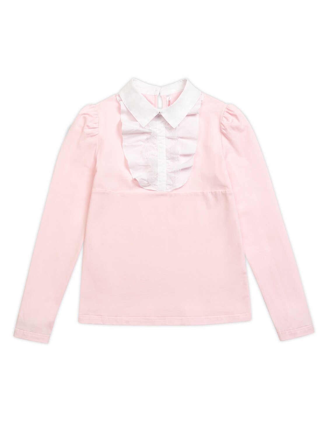 Джемпер для девочек полуприлегающего силуэта с воротником из швейной ткани на отрезной стойке, имитирующим воротник рубашки. Перед украшает жабо из швейной ткани и кружева, собранное под вертикальную планку. Декор в виде брошки с жемчужиной и стразами. По спинке застежка на одну пуговицу. Умеренного объема рукав с небольшой сборкой по окату.