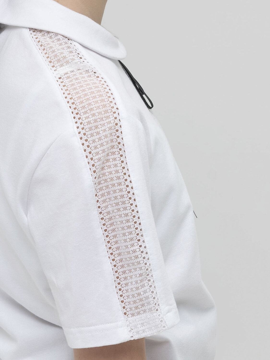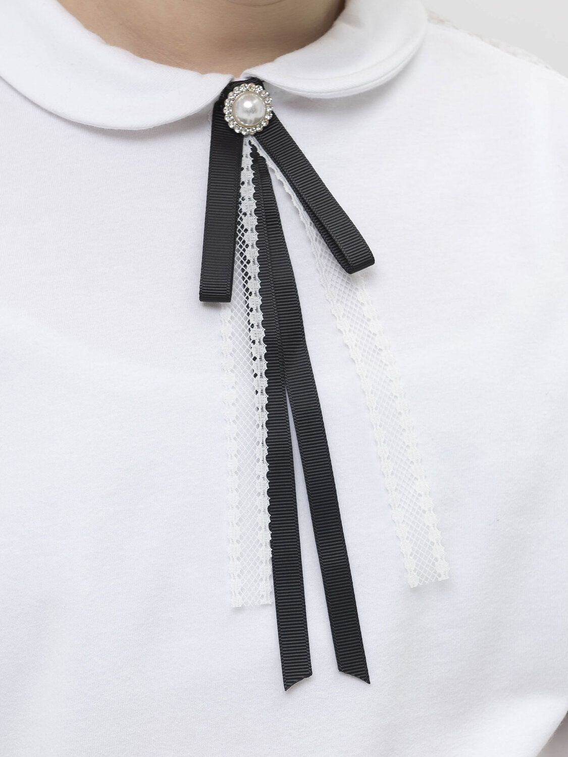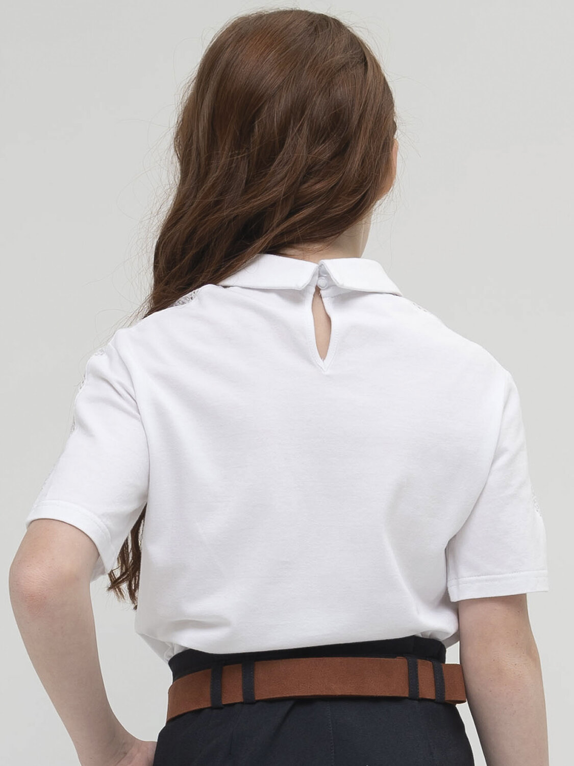 Школьная футболка из хлопкового трикотажа. Мягкая, комфортная ткань хорошо держит форму и не растягивается. Эластичное кружево по рукаву, круглый воротник с бантом из репсовых и кружевных лент, закрепленный пуговицей с жемчужиной и стразами стильные фишки этой модели. Удобная застёжка сзади воротника позволит легко надеть джемпер и не испортить причёску. Эта красивая практичная футболка станет любимой в гардеробе юной модницы.