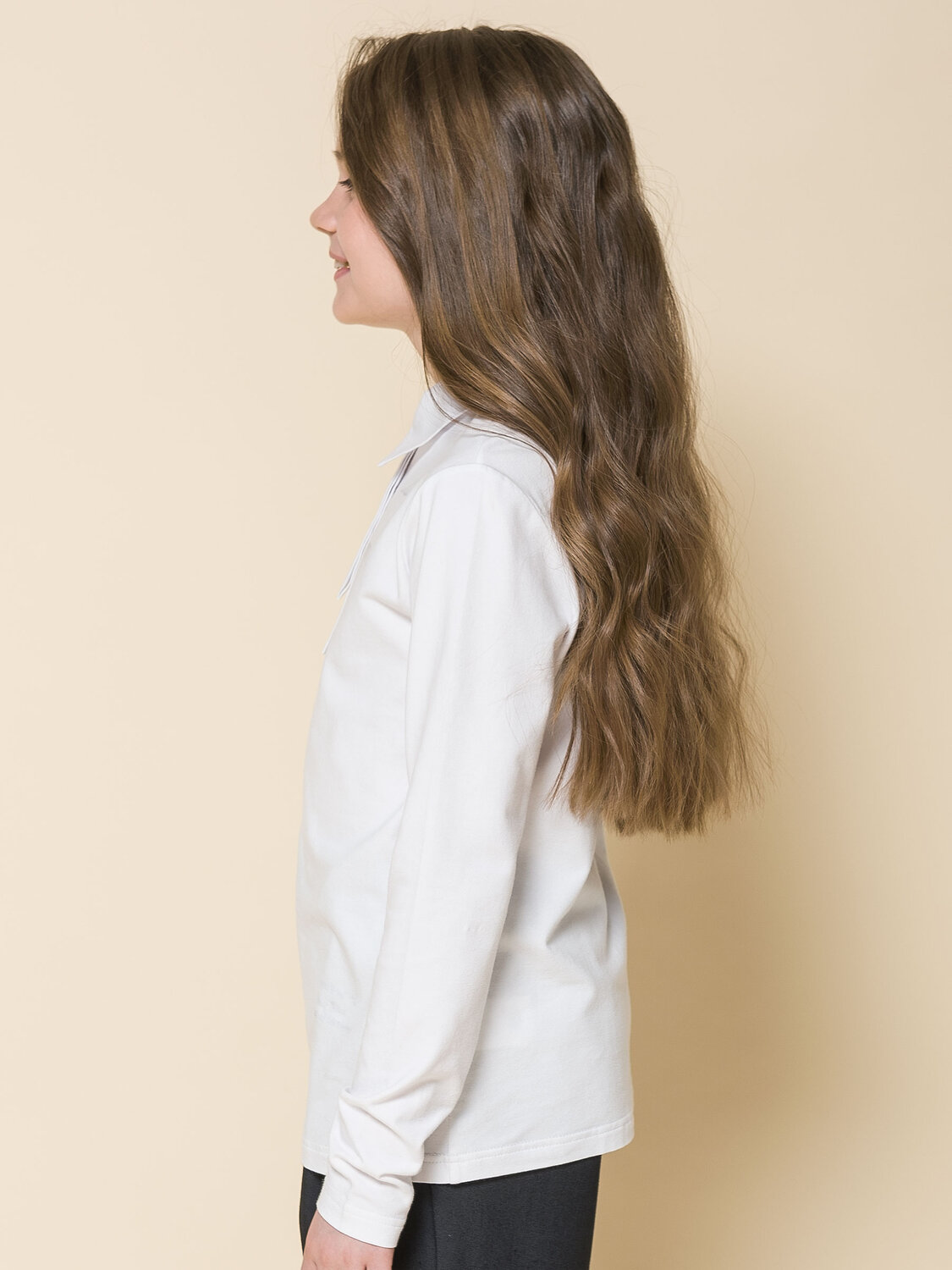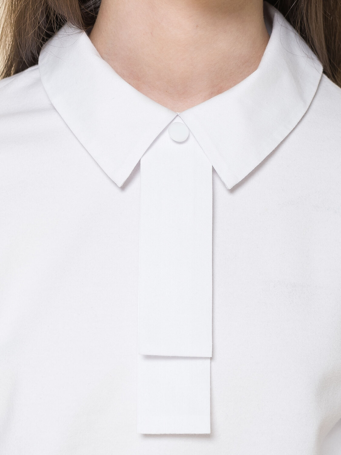 Школьный трикотажный джемпер прилегающего силуэта для девочки. В составе ткани преобладает хлопок — изделие мягкое, дышащее и приятное на ощупь. Эластан помогает сохранять форму и после многочисленных стирок. В джемпере комфортно в течение всего дня, ничего не давит, не колет, не сковывает движения. Блузку украшают белый воротничок и декоративно сложенный галстук из швейной ткани с пуговицей в тон — изюминка этой модели. Он позволяет создавать элегантные образы с пиджаком, жилетом, сарафаном. Модель застёгивается сзади на пуговицу с петлёй из резинки — ребёнку удобно её застёгивать и расстёгивать. Универсальный вариант школьной одежды — подойдёт как для повседневной носки, так и для более торжественного случая.