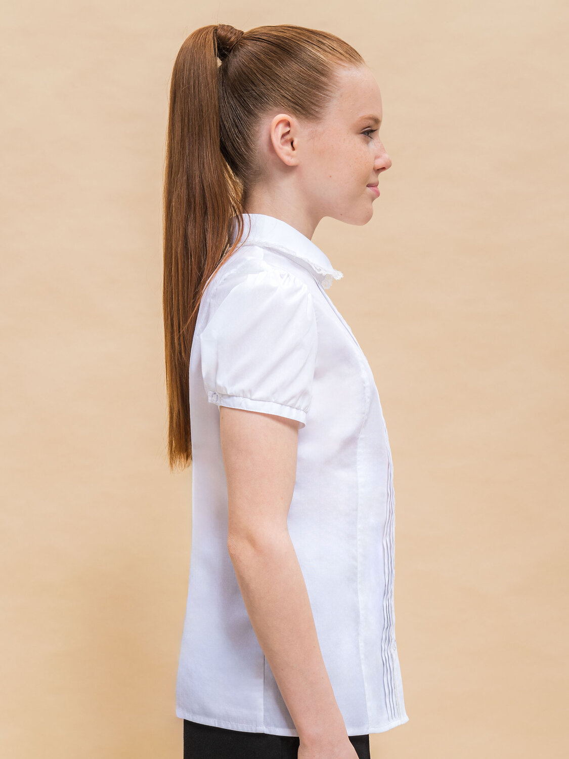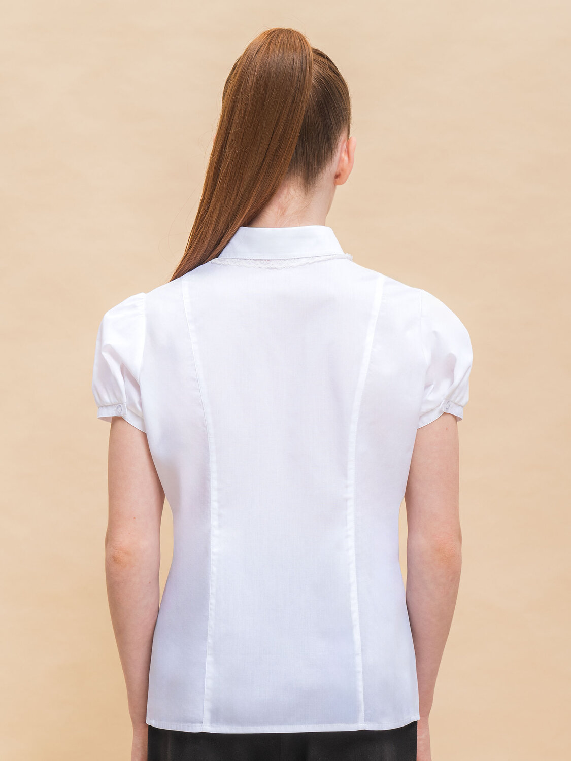 Школьная блузка классического полуприлегающего силуэта с отложным воротником для девочки. Блузка в школу с рельефами по переду и спинке не сковывает движений ребёнка. Перед украшают застроченные вдоль центральной планки складки и тонкое изящное кружево. Модель дополнена короткими рукавами-фонариками на узкой аккуратной манжете. На манжетах есть дополнительная пуговица для их регулировки по ширине (для разной полноты руки). Небольшой круглый воротник с кружевом придаёт изделию женственности и изысканности. В составе ткани преобладает высококачественный хлопок — ребёнку не жарко, кожа дышит. Благодаря полиэстеру блузка в школу для девочки отлично сохраняет форму и первоначальный внешний вид. Модель однотонная, без принта. В ассортименте представлены блузки для девочек школьные универсальных цветов. Они легко сочетаются с различными брюками, юбками, сарафанами. Блузка детская подходит как для повседневной носки в школу, так и для более торжественного случая — в зависимости от того, с чем её надеть. Отличный выбор школьной формы для вашей девочки. Помните о правильном уходе за изделием: рекомендуется стирать при температуре не выше 30 °C, без предварительного замачивания, с изнанки. Это поможет сохранить качество и цвет блузки на долгое время. Не забывайте о выборе правильного размера. Используйте таблицу размеров на фотографии, чтобы выбрать подходящий вариант. Обратите внимание, что цвет товара на экране вашего устройства может отличаться от реального.