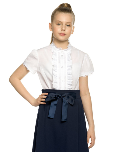 Блузка для девочек полуприлегающего силуэта с рельефами по переду и спинке. По переду нашит фигурный кружевной декор с атласной окантовкой. Рукав фонарик с небольшой сборкой по низу и узкой манжетой. Съемный бант из репсовой тесьмы с жемчужиной и стразами.