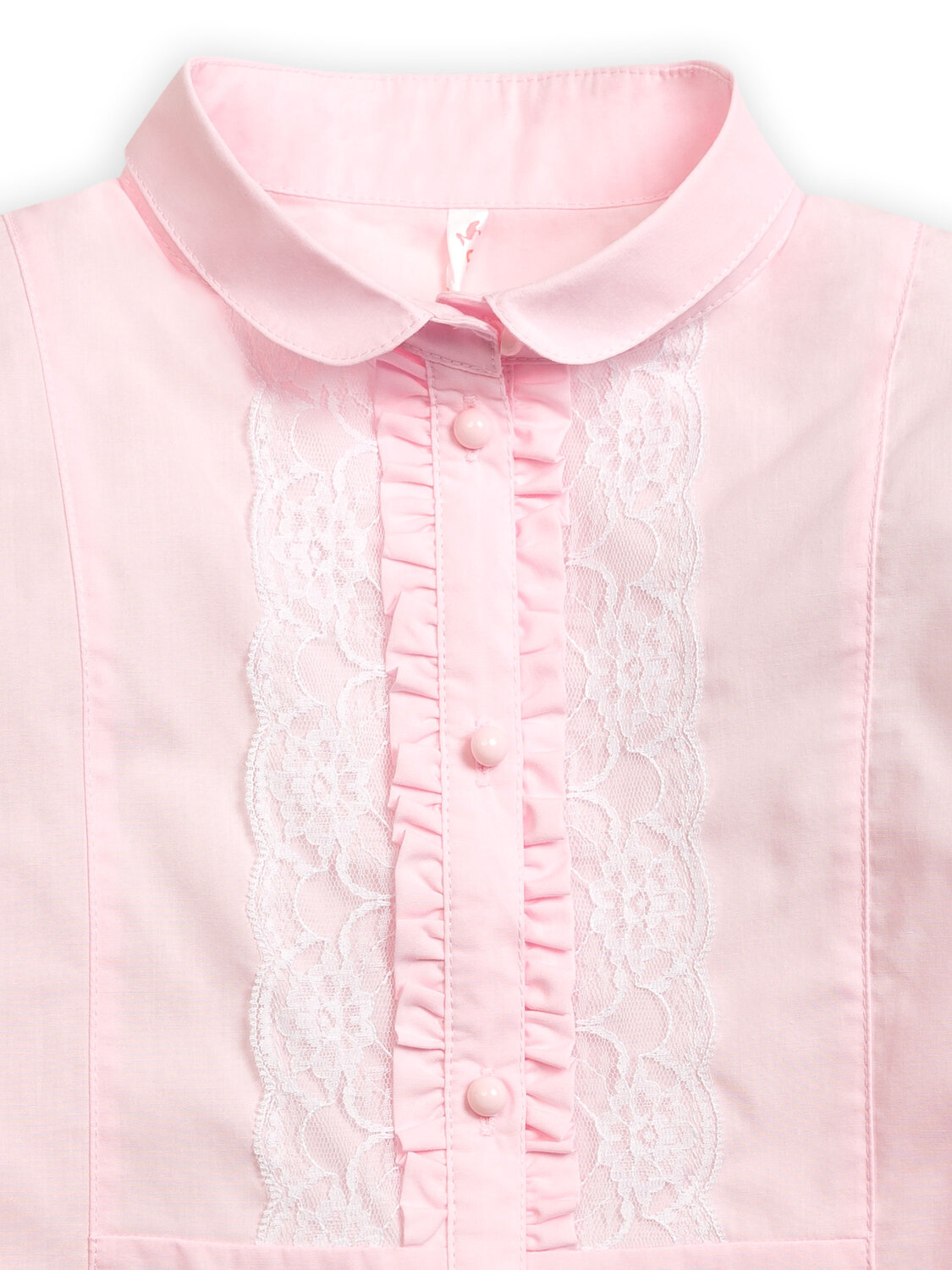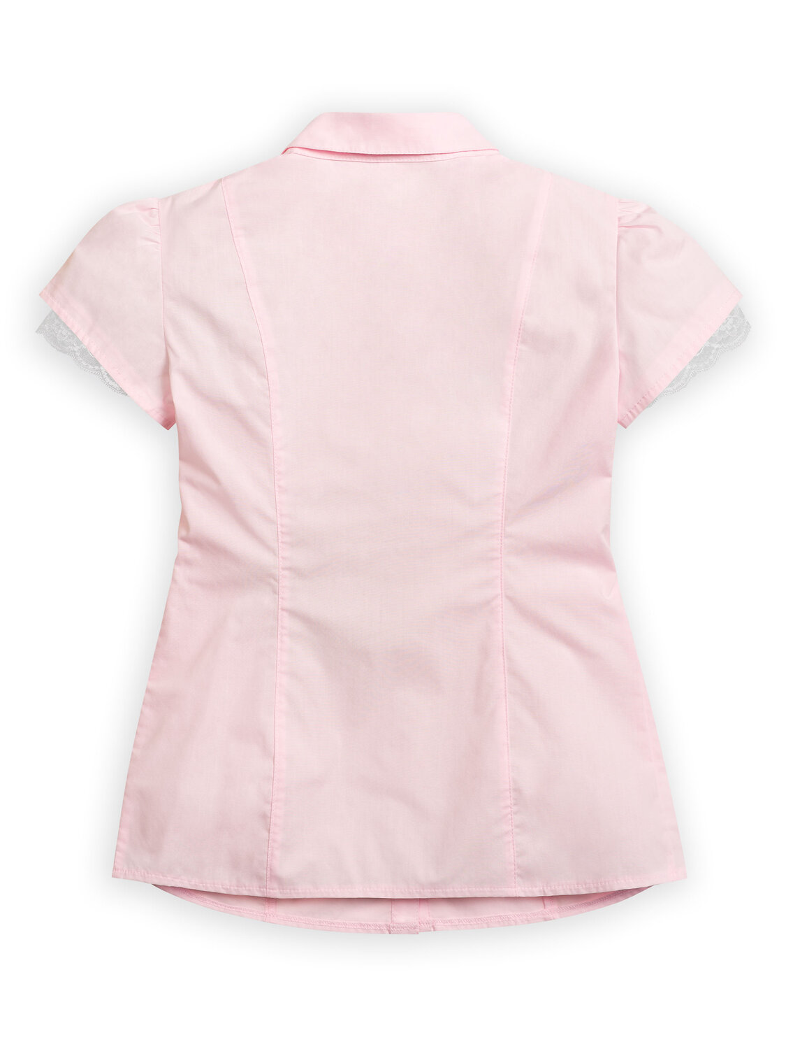Блузка для девочек с коротким рукавом. Классическая блузка полуприлегающего силуэта с рельефами по переду и спинке. Кружево вдоль планки, изящный воротничок на стойке. Двойной рукав. Верхний слой выполнен из основной ткани, нижний слой из сетки и кружева.
