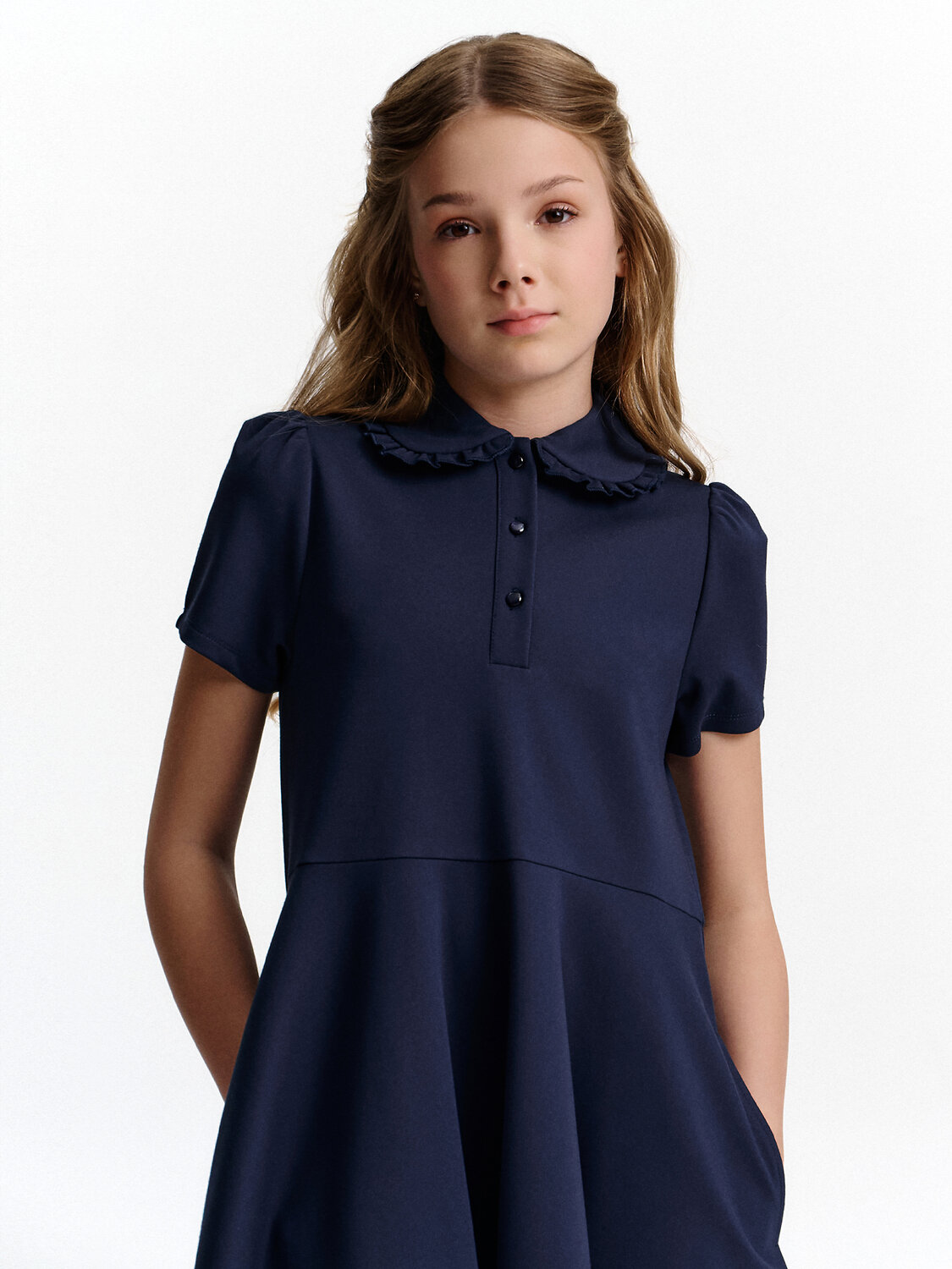 Нежное, удобное и продуманное до мелочей трикотажное платье для девочки, которое подойдёт и для школы, и для прогулок, и даже для особого случая. Основа — любимый многими стиль поло, но с характером: аккуратный воротник с рюшей и милые рукава-фонарики придают образу утончённость и лёгкую, ненавязчивую элегантность. Низ платья расклешён, без лишнего объёма, так что в нём удобно бегать, сидеть за партой и чувствовать себя уверенно весь день. А карманы в юбке — приятный бонус, который обязательно оценит каждая девочка. На груди — планка с пуговицами, а мягкий округлый воротник украшен рюшей из той же ткани. Лёгкая сборка на рукавах делает силуэт воздушным и живым. Платье для школы не требует особого ухода, легко стирается и держит форму даже после активных будней. Это не просто школьное платье — это одежда с чувством вкуса. Стиль без перегруза, удобство без компромиссов и универсальность, которая работает каждый день.