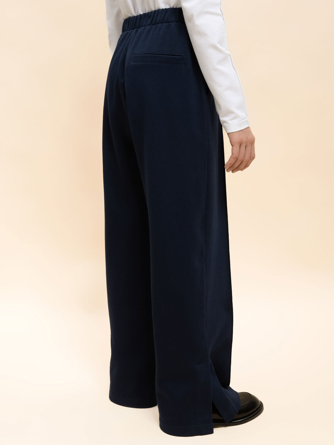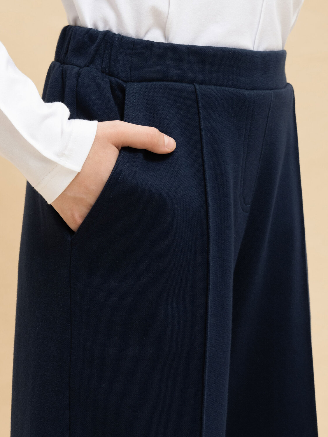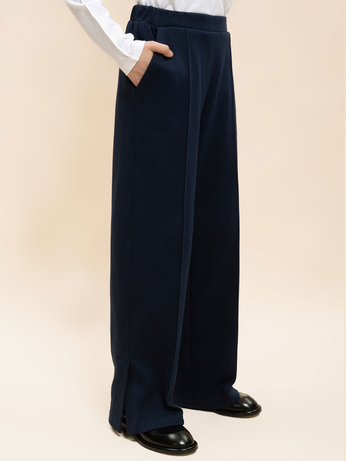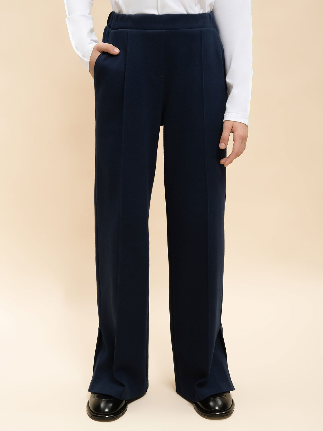 Трикотажные брюки прямого силуэта. Пояс на резинке по спинке с дополнительной встроенной утяжкой на резинку с петельками. По переду боковые карманы и застрочены стрелки. Имитация застежки, гульфика. По правой спинке имитация прорезного кармана с листочкой. По низу изделия в боковых швах располагаются шлицы