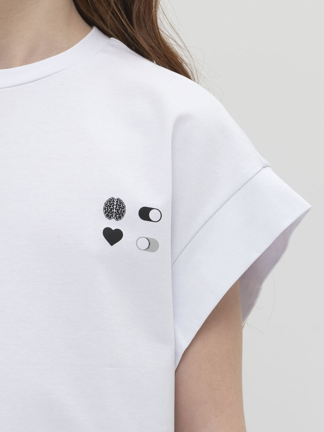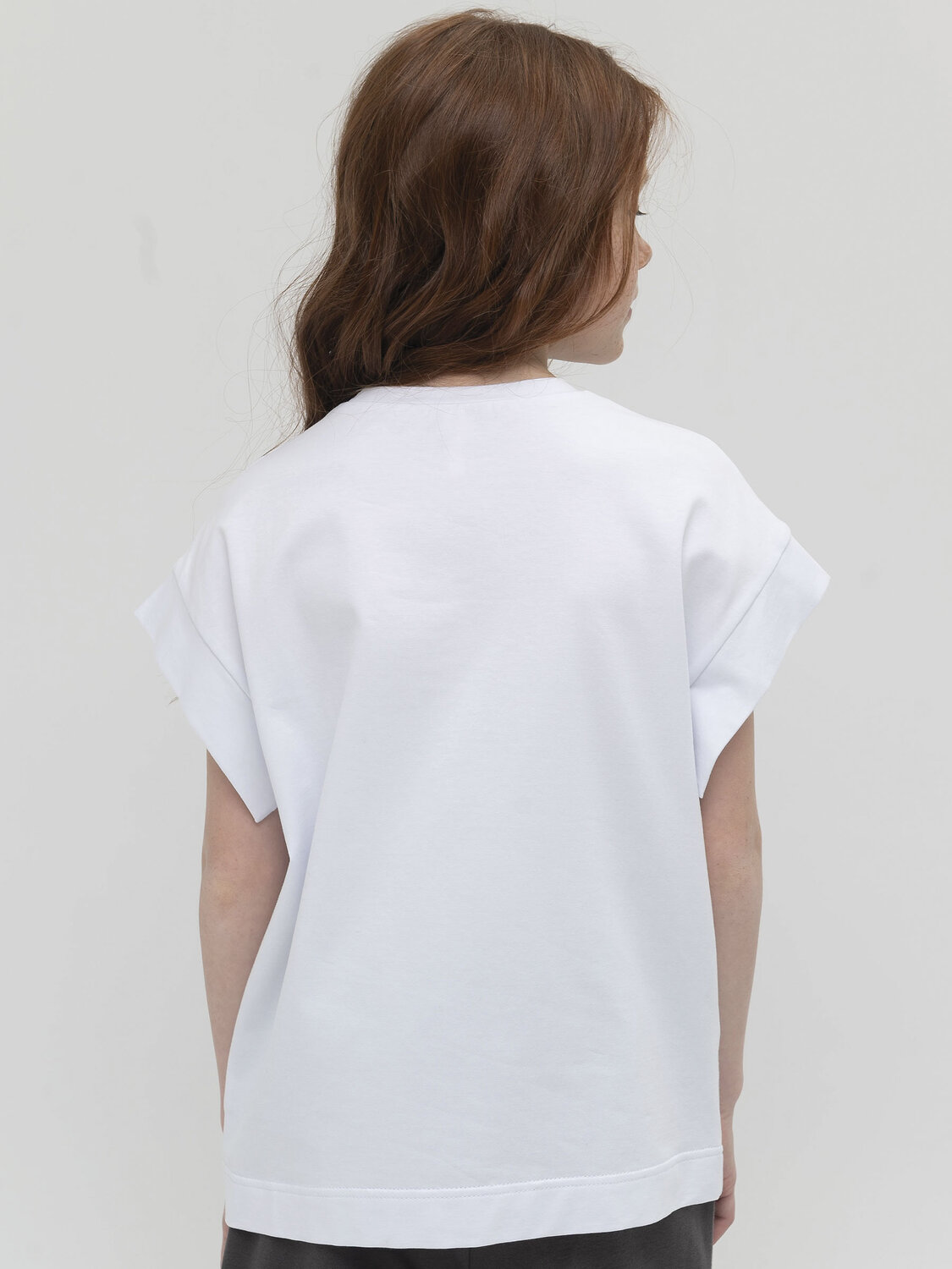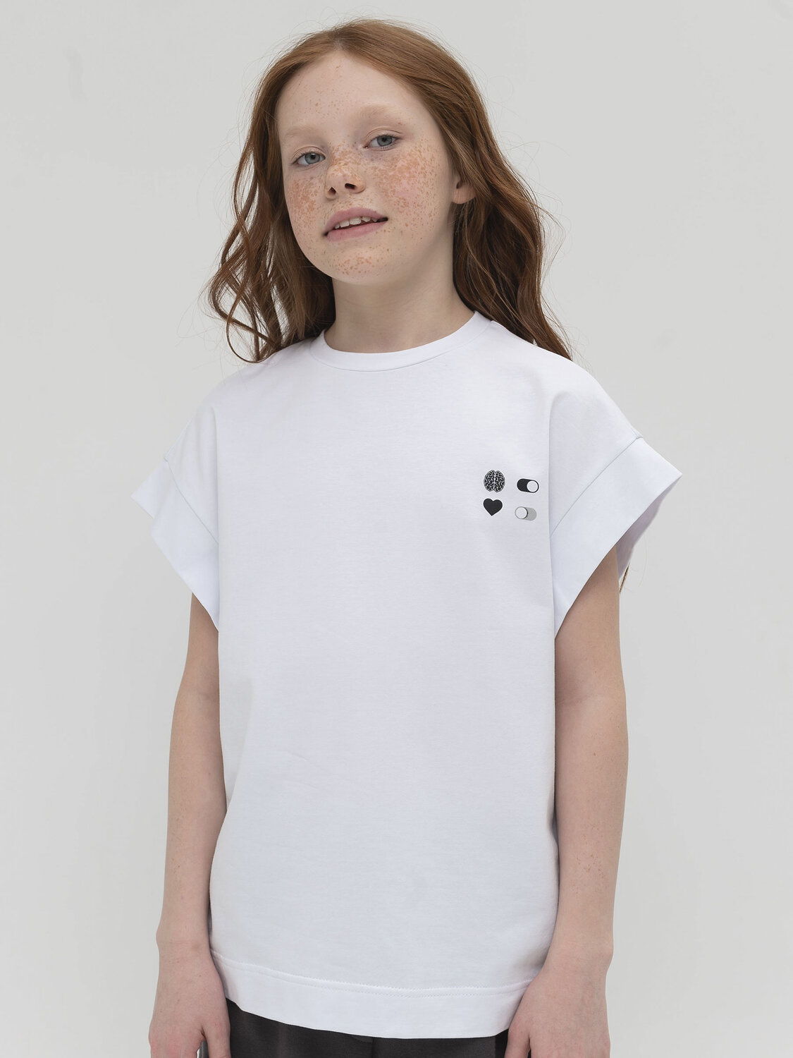 Футболка оверсайз из плотного пластичного трикотажа. Футболка очень комфортная и приятная к телу, держит форму, не мнется. На рукавах акцентная деталь небольшие крылышки. Прямой силуэт подарит свободу и не будет стеснять движений. По переду трендовая минималистичная мобильная инфографика: включи мозг, выключи чувства. Лаконичный дизайн прекрасно сочетается как со школьной формой, так и с одеждой для повседневной носки, и станет основой для разнообразных стильных образов.