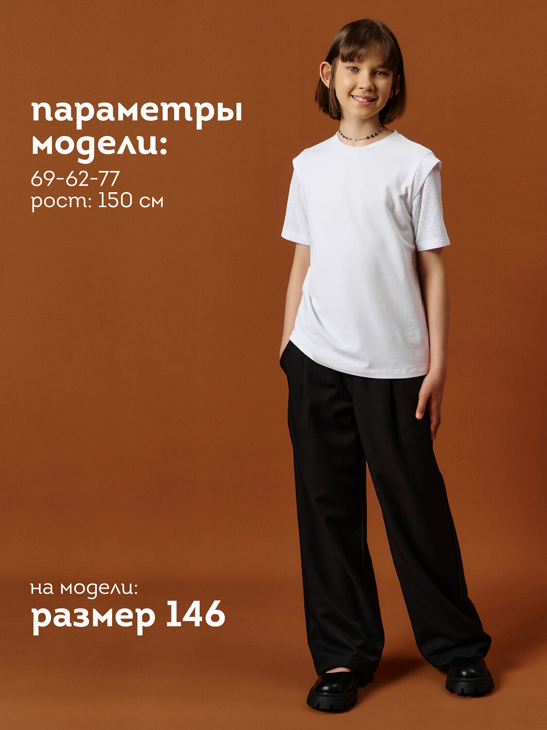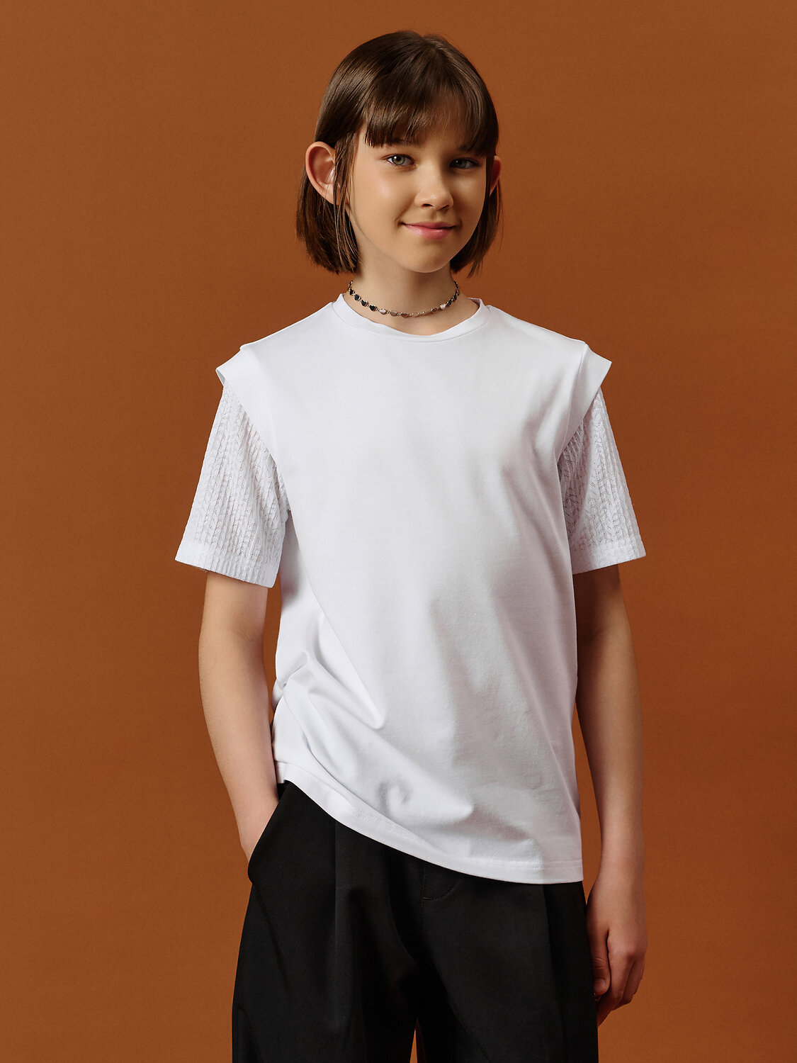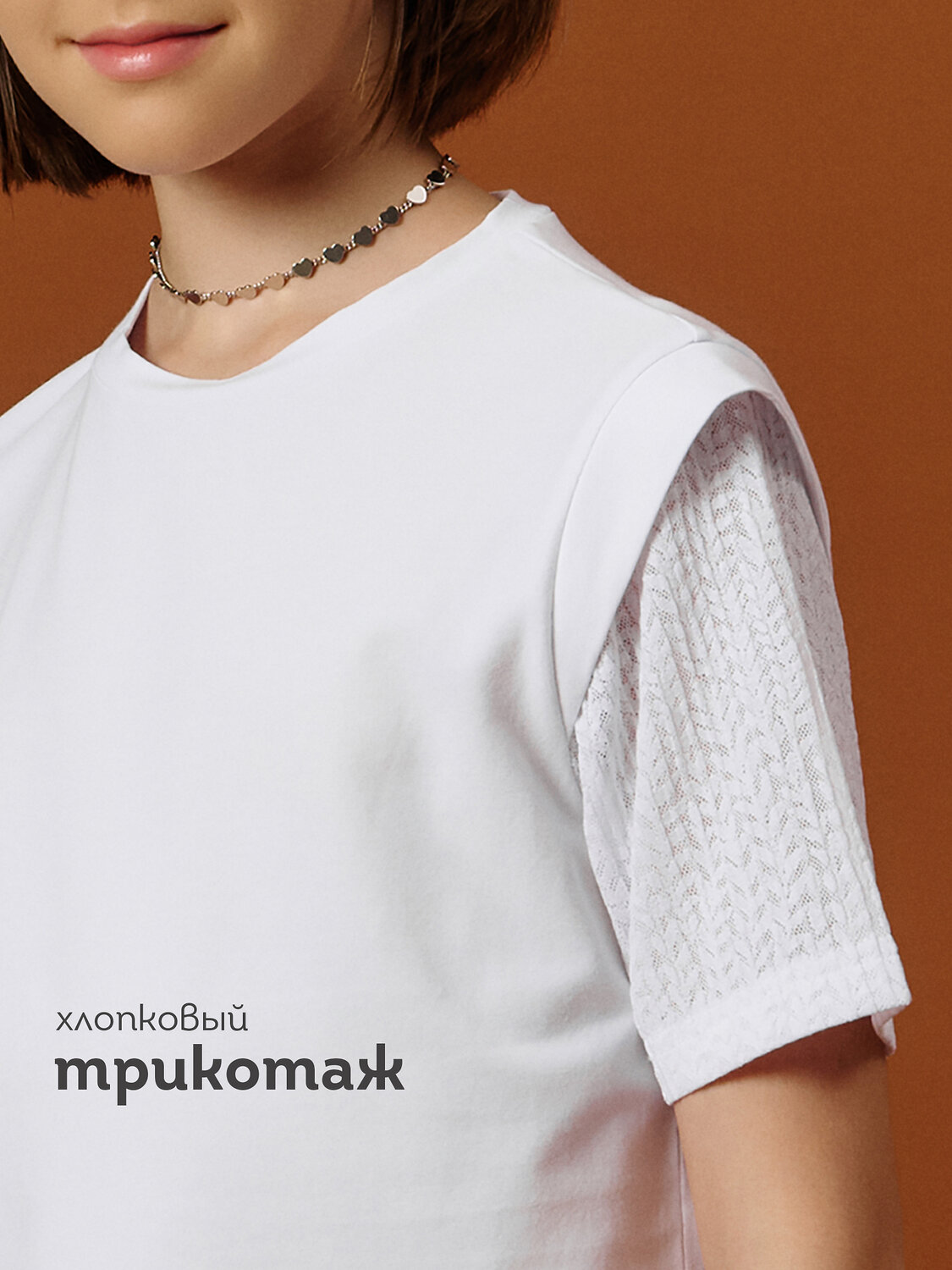 Эта футболка станет настоящей находкой для школьного гардероба! Выполнена из приятного к телу хлопкового трикотажа с добавлением эластана — материал дышащий, мягкий и слегка тянется, обеспечивая комфорт в течение всего дня. Особенности дизайна: Короткие рукава из нежного кружева с рельефным горизонтальным узором придают образу лёгкость и утончённость. Кружево абсолютно не колется и не раздражает кожу, благодаря качественному материалу и продуманной обработке швов. Полуприлегающий силуэт красиво садится по фигуре, не стесняя движений. Эффектные крылышки на плечах из основной ткани добавляют нарядности и игривого настроения. Удобство и универсальность: Идеалена для школы, праздников, фотосессий или семейных встреч. Легко сочетается с юбками, брюками и сарафанами. Проста в уходе: не требует особых условий при стирке, сохраняет форму и внешний вид после многократного использования. Эта футболка — отличный выбор для тех, кто ценит комфорт и хочет выглядеть красиво каждый день. Используйте таблицу размеров на фотографии, чтобы выбрать подходящий размер. Обратите внимание, что цвет товара на экране вашего устройства может отличаться от реального.