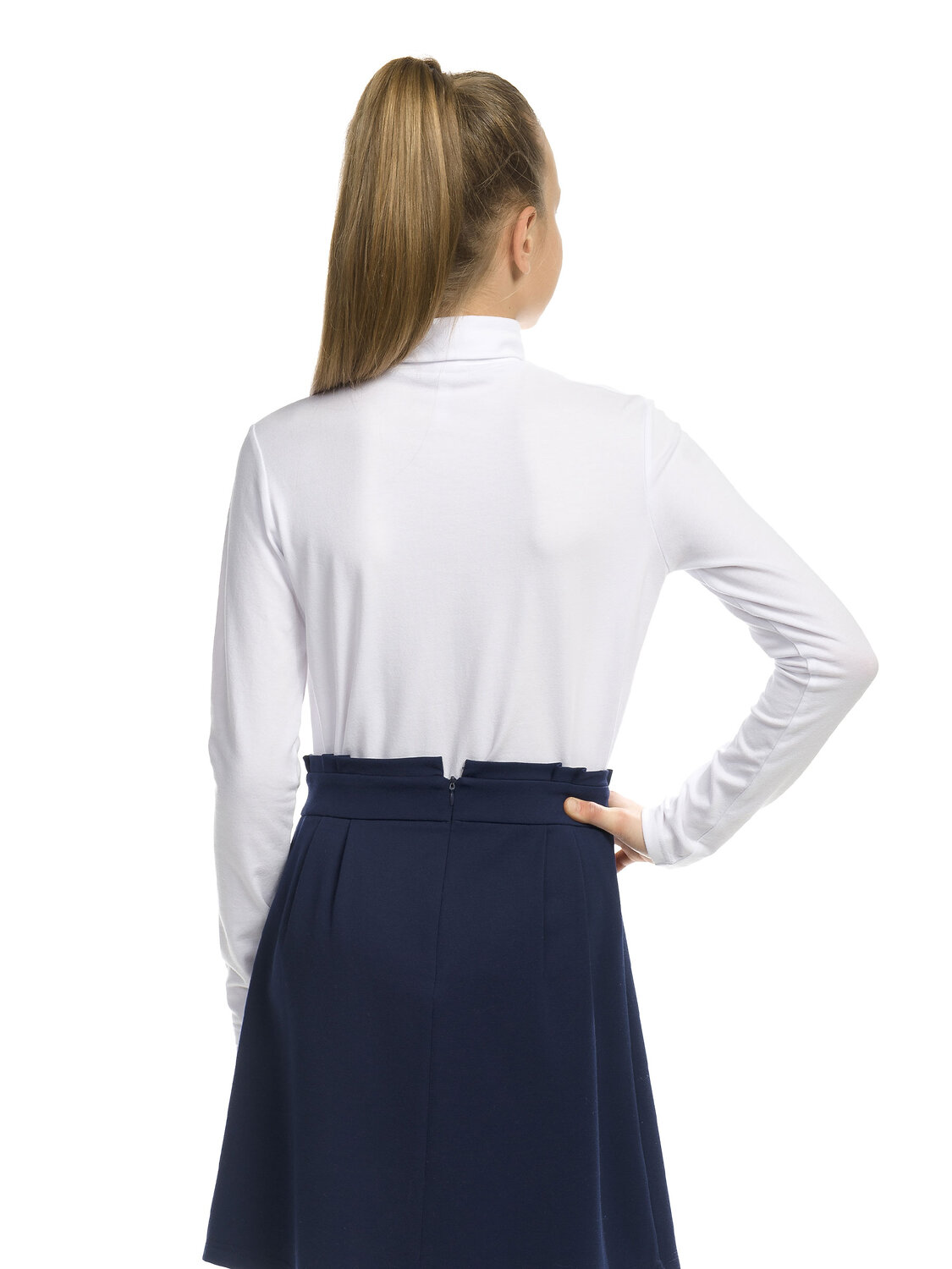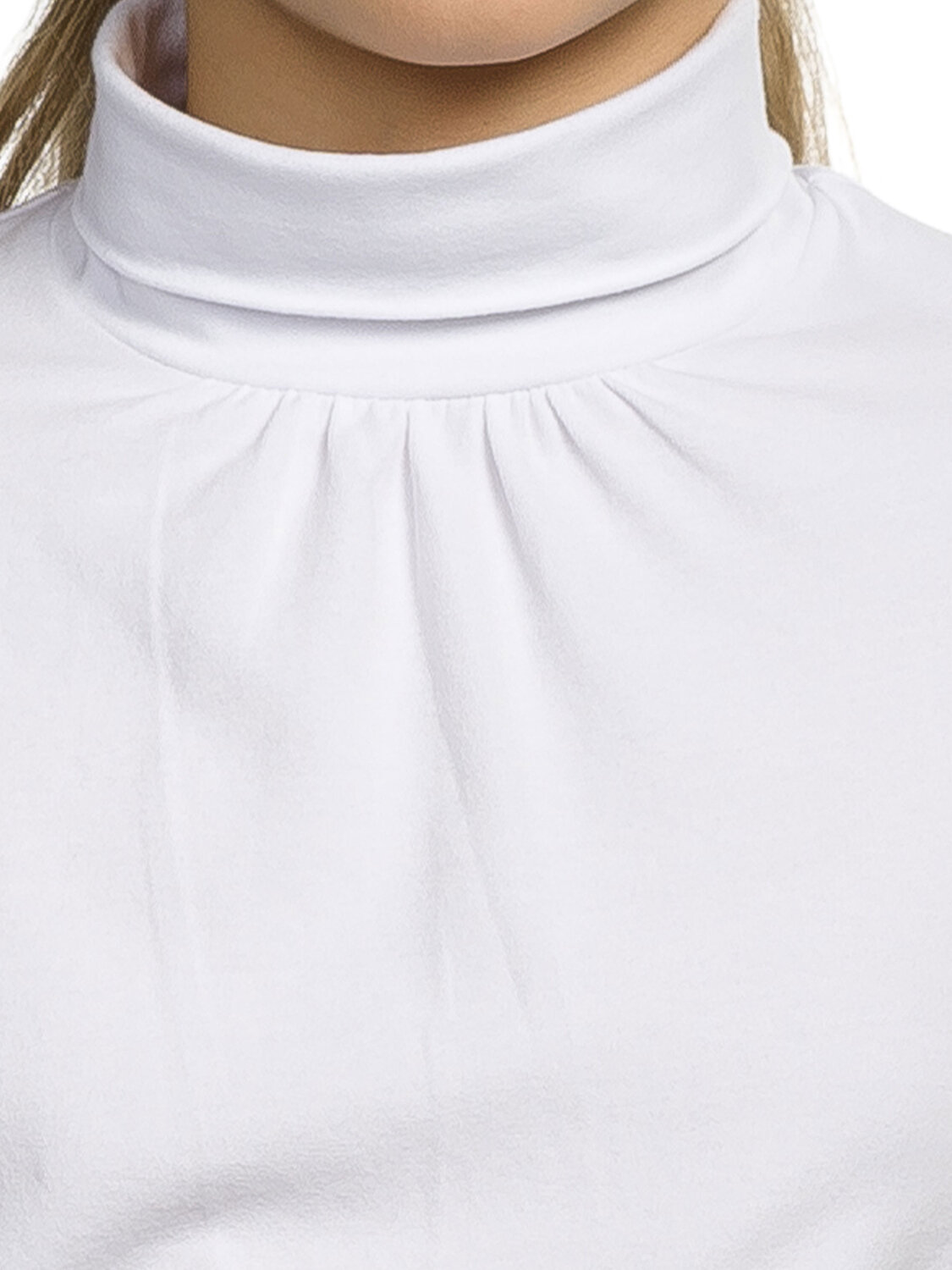 Джемпер для девочек из мягкого хлопкового трикотажа с добавлением эластана, полуприлегающий силуэт, без застежки. Воротник-стойка отворачивается, деликатные сборки у горловины по центру переда.