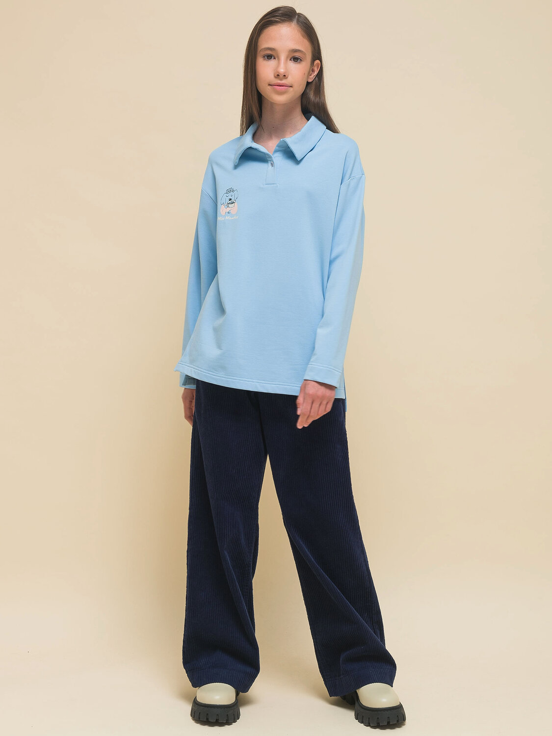 Джемпер детский для девочки. Изделие умеренного объёма со спущенным плечом подарит ребёнку комфорт и свободу движений. Джемпер с воротником отложным в актуальном стиле поло, планка застёгивается на пуговицу. Спинка немного длиннее переда, по бокам разрезы — актуальные, стильные детали. Джемпер неприхотлив в уходе. В составе ткани (футер с начёсом) преобладает высококачественный хлопок — толстовка мягкая и великолепно пропускает воздух — кожа ребёнка дышит. Благодаря эластану изделие сохраняет прекрасную форму в течение длительного времени. Свитшот с принтом по переду и спинке. Милый принт с уютным настроением изображает собачку в бигуди и с чашкой кофе, надписи переводятся: «время для счастья», «пропустить минутку». Принты эластичные и стойкие — легко переносят многочисленные стирки. Джемпер выполнен в нежном голубом цвете, его просто комбинировать с любыми брюками, легинсами, джинсами. Размерная линейка: 2 (92): 3 (98): 4 (104): 5 (110): 6 (116): 7 (122): 8 (128): 9 (134): 10 (140): 11 (146). Свитшот с начёсом подходит девочкам дошкольного возраста, младшим школьницам и девочкам-подросткам. Его можно носить в детский сад, на прогулки, во время отдыха, а также дома. Такие джемперы идеальны для круглогодичного применения: летом, осенью, зимой, весной и демисезон. Это красивый и практичный подарок дочери, внучке или сестре на Новый год и любой другой праздник.