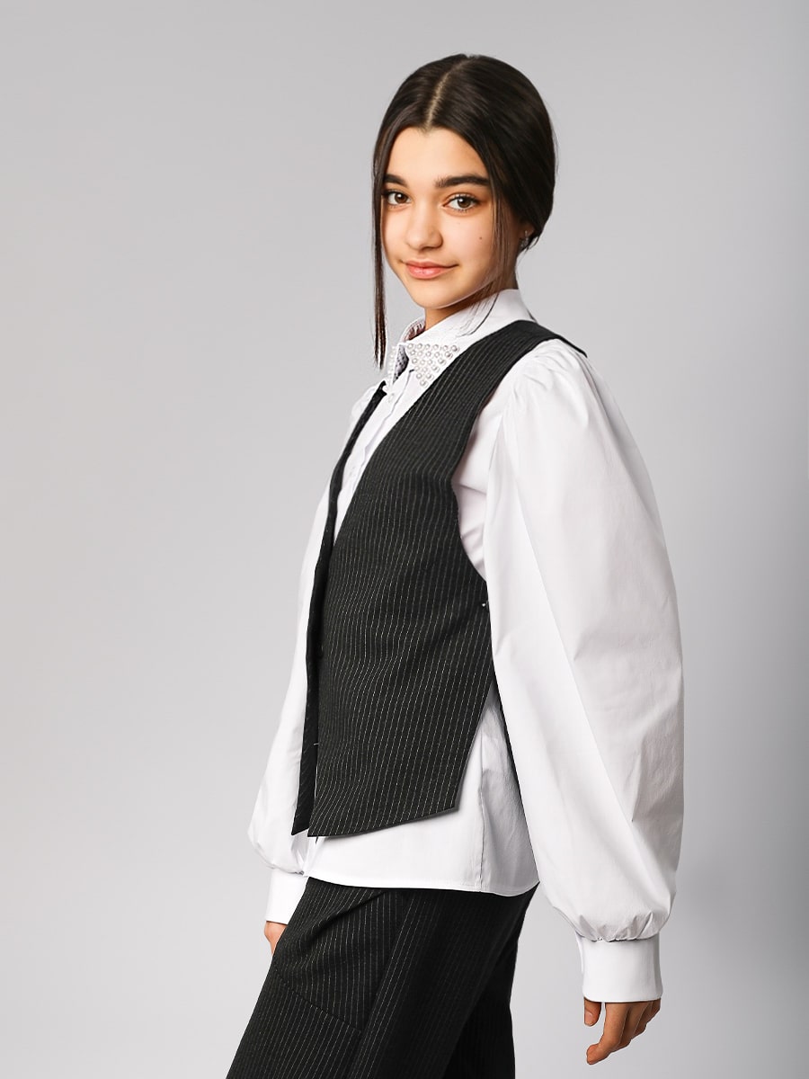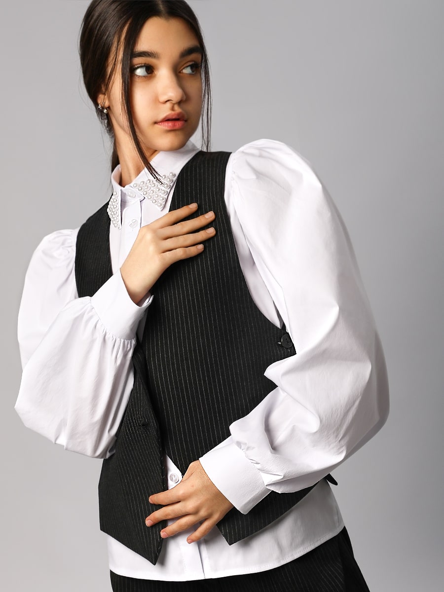 Блузка для девочки СольПерец, на пуговицах, из натурального хлопка. Особенностью блузки являются пышные рукава фонарики и отложной воротник украшенный жемчугом, которые добавляют ей изящества и уникальности. Блузка прекрасно сочетается с брюками или с юбкой, подчеркнёт индивидуальный стиль девочки, и разнообразит ее повседневный школьный образ. Цвет: белый; Материал: хлопок стрейч;хлопок стрейч; Состав: 70% хлопок, 27% полиамид, 3% спандекс.