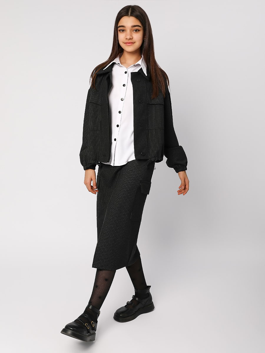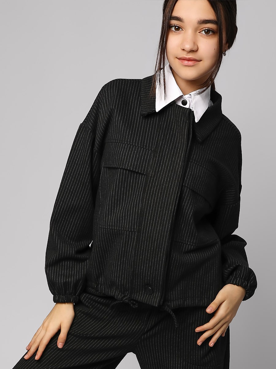 Бомбер для девочки СольПерец на пуговицах с потайной планкой, отложным воротником и большими накладными карманами с клапаном. Рукава на мягкой эластичной резинке, низ бомбера дополнен кулиской. Бомбер выполнен из износостойкой трикотажной ткани которая долго сохраняет форму и привлекательный внешний вид. Бомбер прекрасно сочетается с юбками и брюками. Подойдёт для посещения школы, официального или праздничного мероприятия. Цвет: темно серый; Материал: хлопок стрейч;хлопок стрейч; Состав: 73% хлопок, 22% полиэстер, 5% полиуретан.