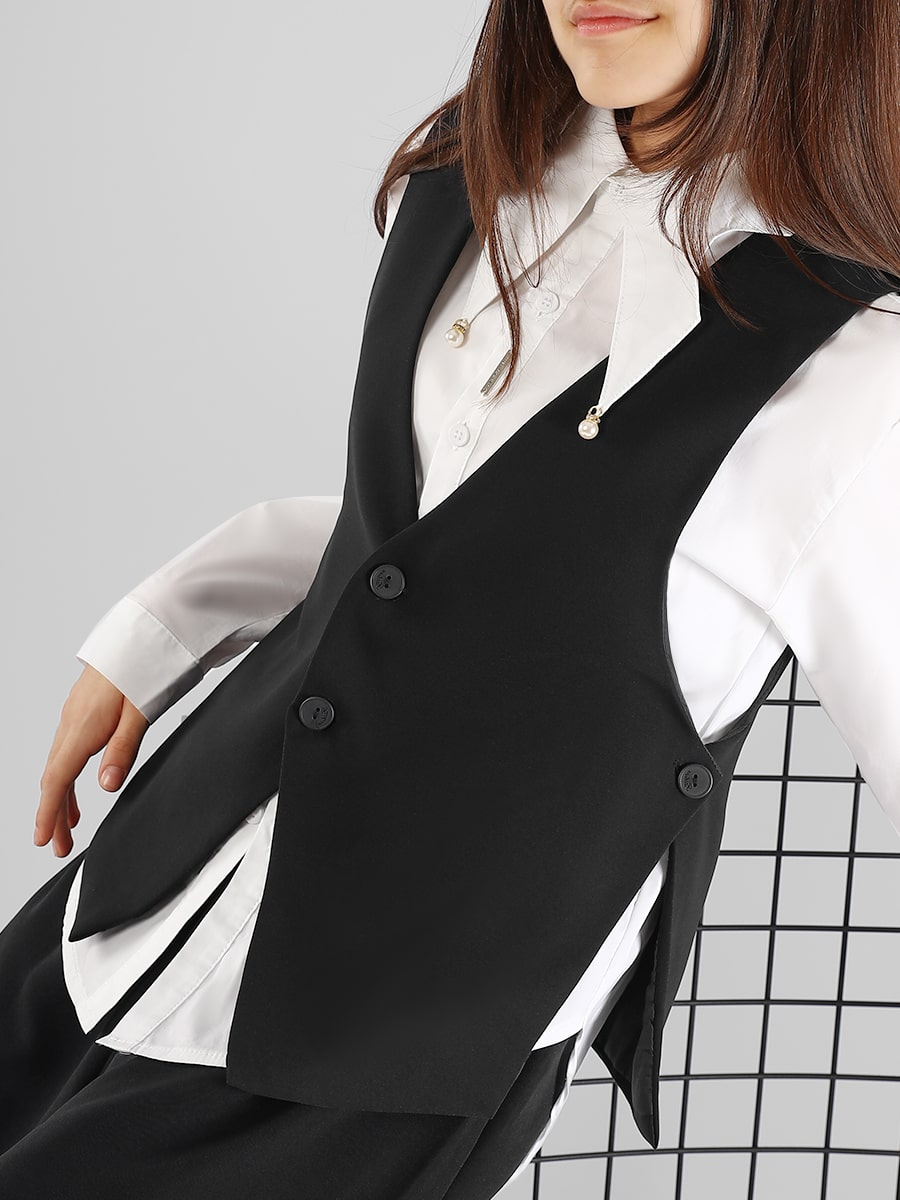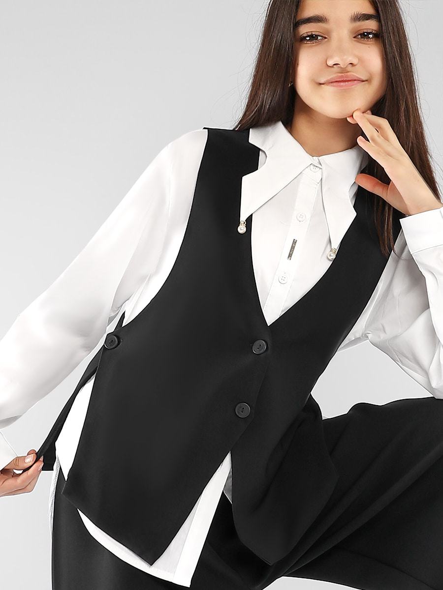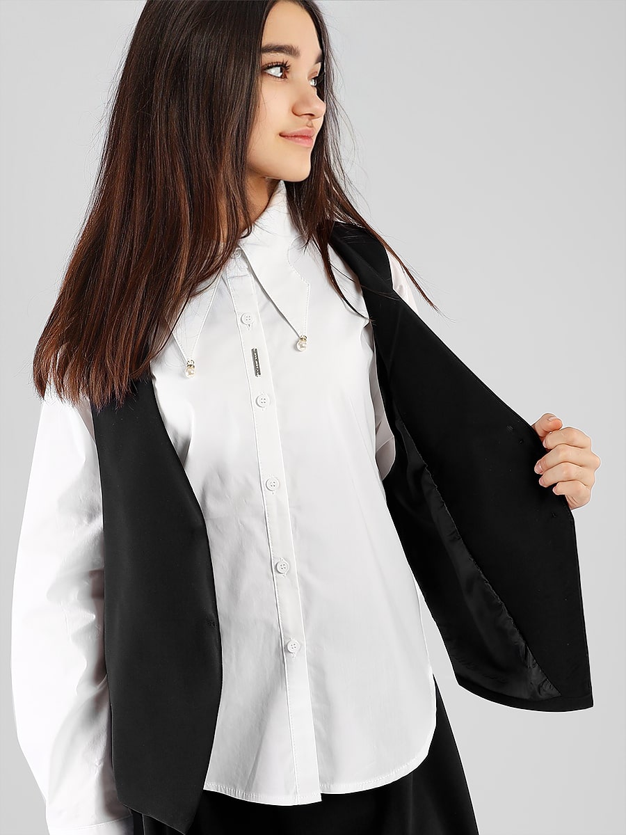Классический, однобортный жилет для девочки СольПерец. Жилет с подкладом, выполнен из износостойкой костюмной ткани Босс которая долго сохраняет форму и привлекательный внешний вид. Жилет прекрасно сочетается с юбками и брюками. Подойдет для посещения школы, официального или праздничного мероприятия. Цвет: темно-синий;черный; Материал: костюмная ткань;костюмная ткань; Состав: 70% полиэстер, 30% хлопок.