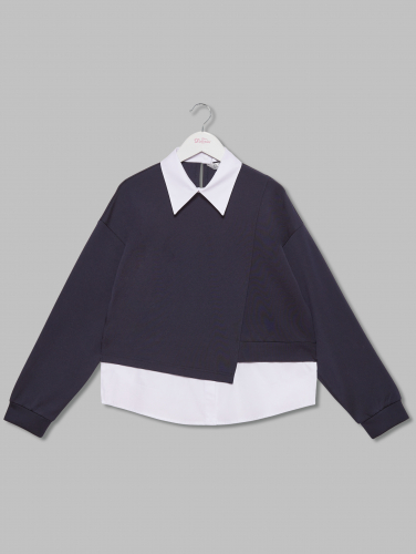 Джемпер-обманка для девочки из трикотажного полотна высокого качества с добавлением эластана.  Основная ткань -  трикотаж с добавлением эластана. Рукав и низ из блузочной ткани. Спущенное плечо. Застежка по спине на пуговицу.