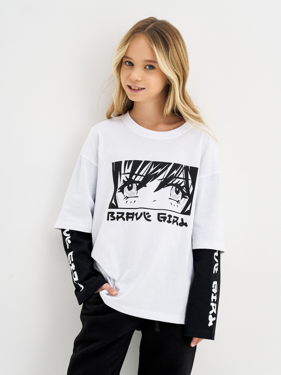 Лонгслив для девочки оверсайз с принтом из кулирной глади