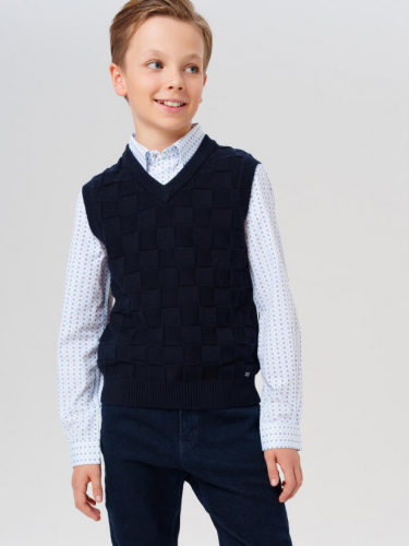 Классический синий школьный джемпер с имитацией сорочки для мальчика подростка от бренда PlayToday — стильное решение 2-в-1, которое экономит время утром и всегда выглядит опрятно. Уютный трикотаж и несъёмный воротник создают аккуратный образ без лишних слоёв.