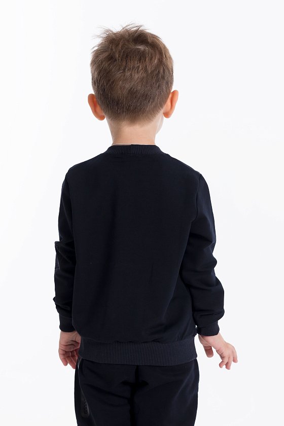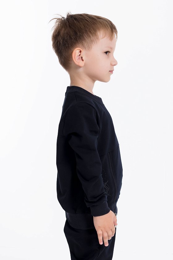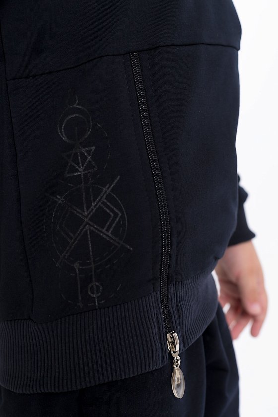 Джемпер из футер петли с принтом на рукаве. Горловина, низ рукавов и пояс изделия из кашкорсе. Спереди в качестве отделки замок и принт.