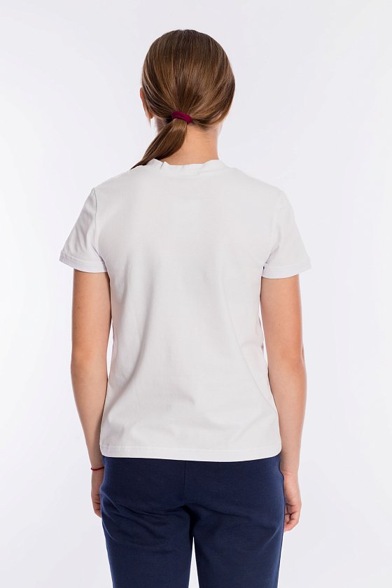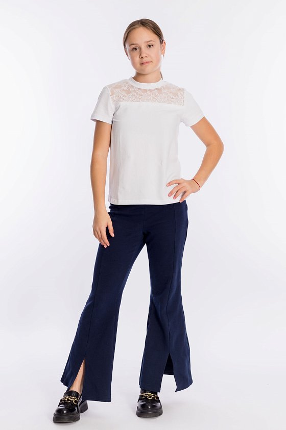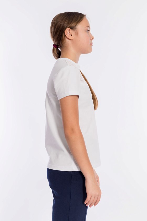 Джемпер выполнен из хлопка с лайкрой, с кружевной кокеткой спереди. Короткий рукав, по горловине планка. Отличный вариант для школы.