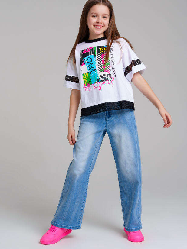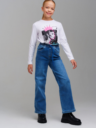 Джинсы для девочки. Застежка на пуговицу, пояс с внутренней утяжкой. Крой Wide leg ― это свободная посадка и расклёшенные от бедра штанины. Высокая посадка.