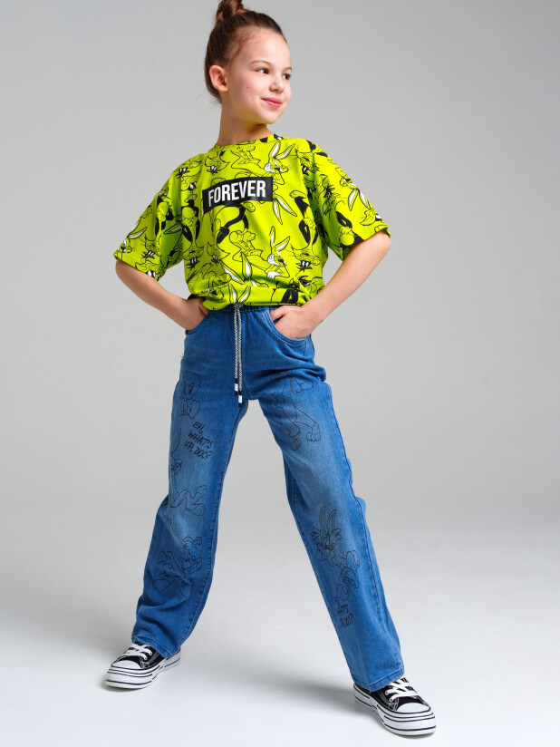 Джинсы для девочки. Эластичный пояс со шнурком. Крой Wide leg ― это свободная посадка и расклёшенные от бедра штанины. Высокая посадка.