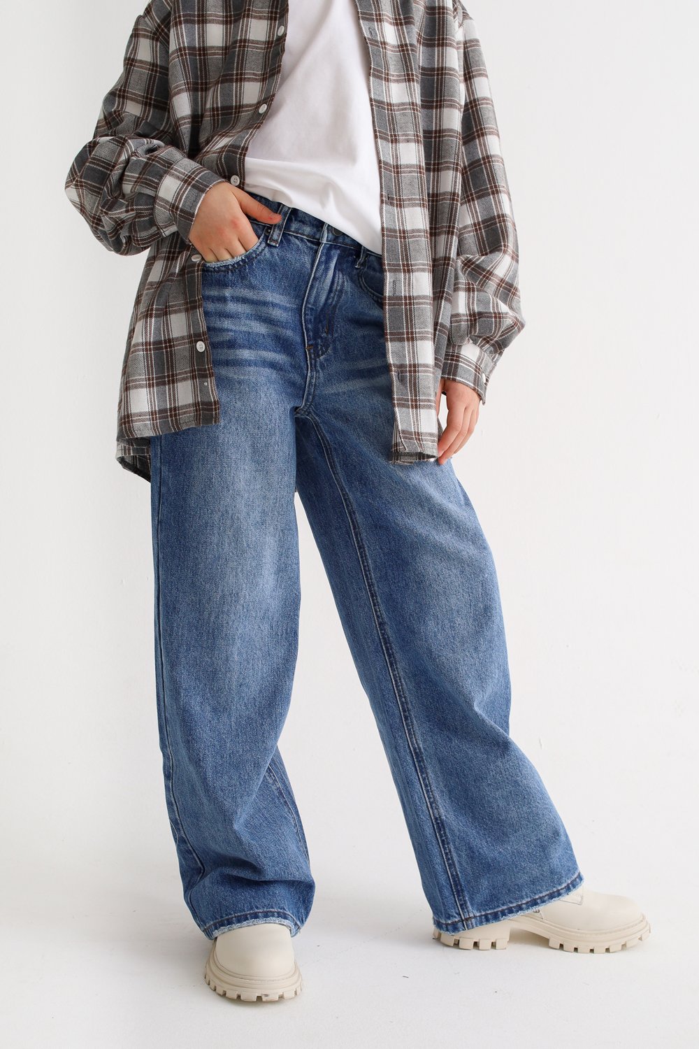 Брюки свободного силуэта. Карманы по бокам. Накладные карманы сзади.
