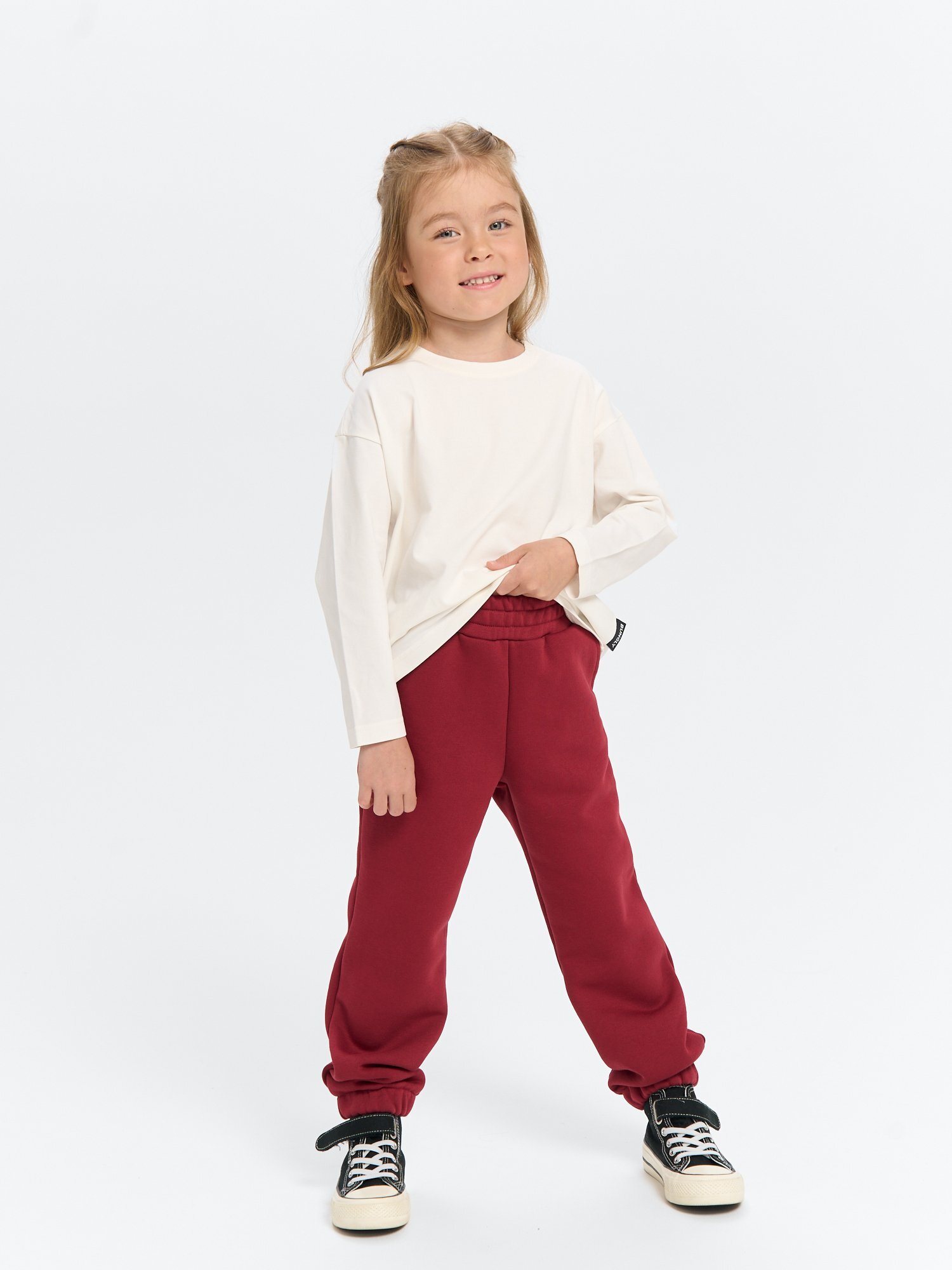 Джоггеры из футера с начёсом – универсальное решение для любого гардероба осенью и весной. Удобно надеть утром в садик и не только, после – отправиться на кружки или к друзьям в гости.