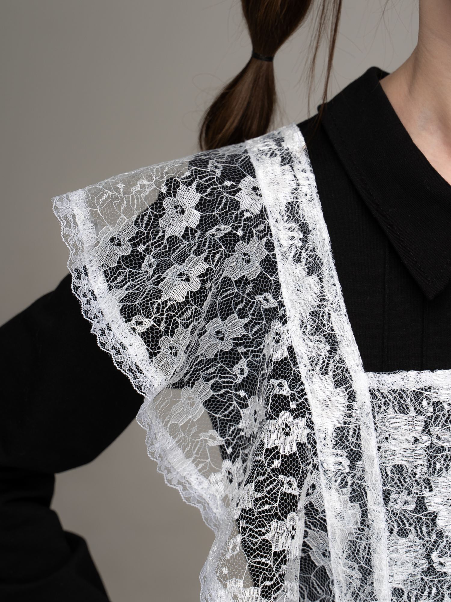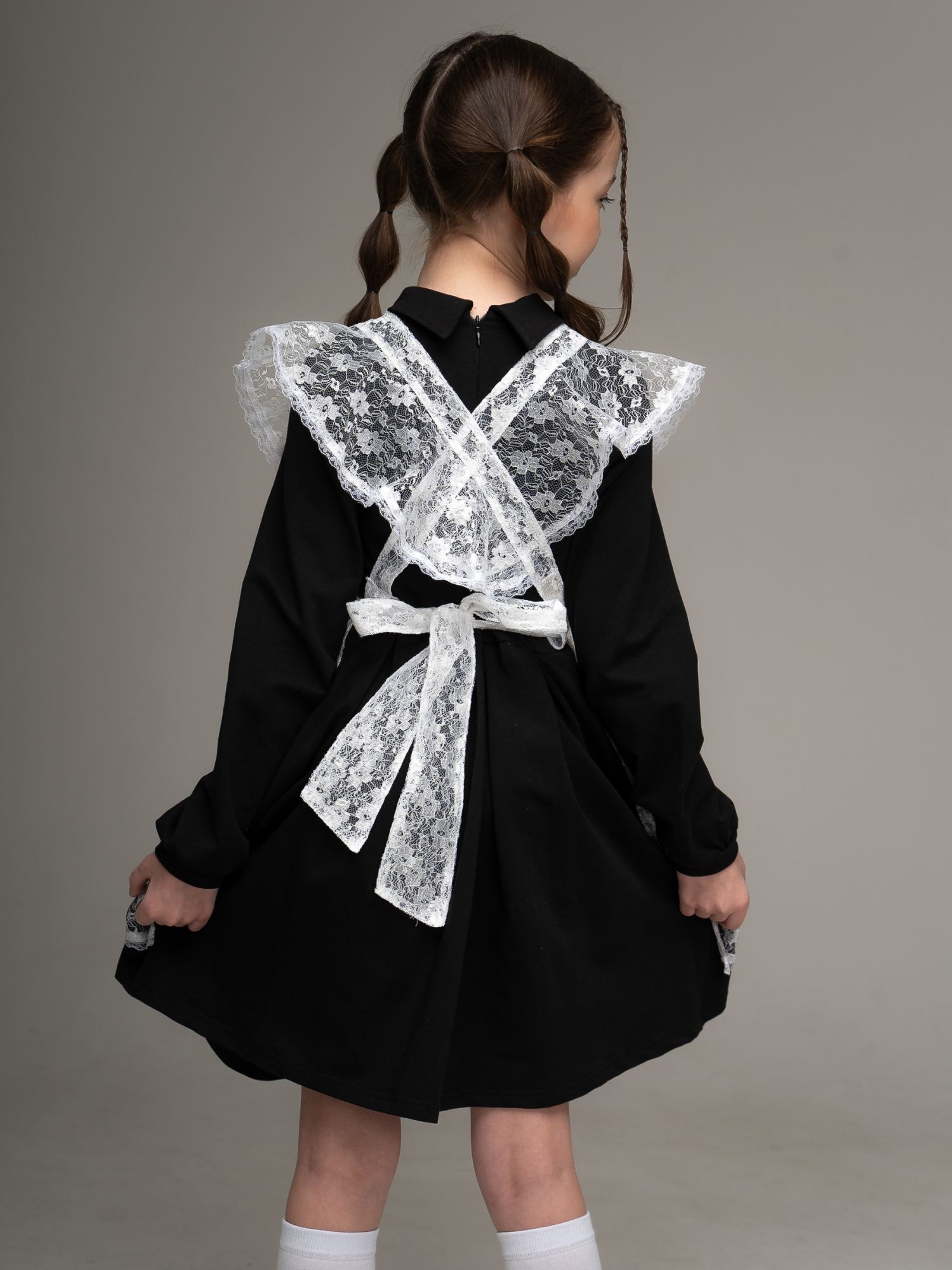 Нарядный фартук для школы из гипюра белого цвета для девочки. Фартук для торжественных мероприятий на 1 сентября и другие. Бретели с пышными крылышками и низ фартука отделаны тесьмой. Гипюр с цветочным рисунком достаточно традиционная ткань для нарядного белого фартука в школу. Обращаем ваше внимание, что бретели на спинке перекрещены. Это сделано для удобства, чтобы лямки не падали с плеч. По линии талии мягкие складки, пояс завязывается бантом.