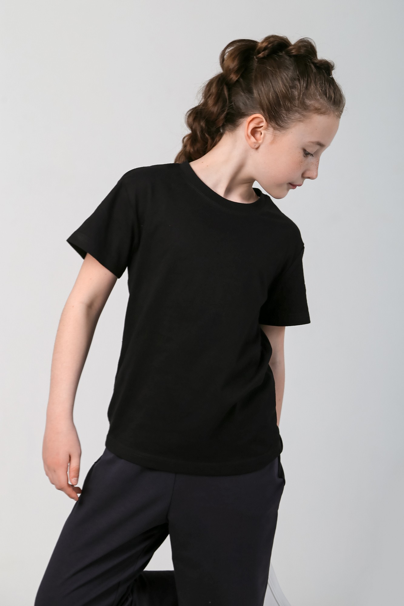 Базовая футболка для девочки, из кулирки плотностью 160г/м2. Модель со слегка спущенной линией плеч и округлым вырезом горловины.