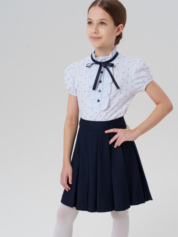 Полуприлегающий силуэт дарит свободу движений, а нежные детали — жабо из ткани с кружевом и бант на воротнике — добавляют образу нарядности и утончённости. Эта блузка с коротким рукавом легко вписывается в школьный дресс-код.