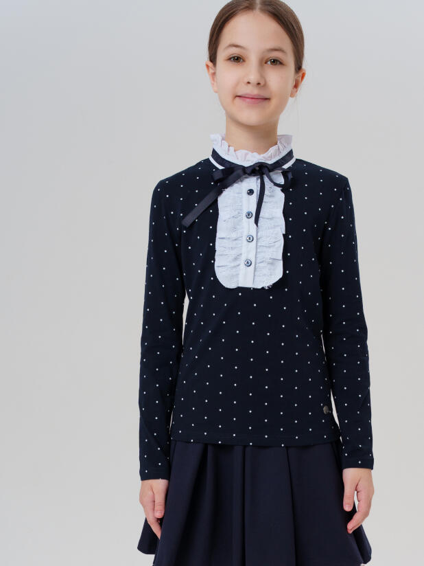 Женственный крой с декоративным жабо и воротником-стойкой делает образ нарядным, но при этом остаётся удобным для школьных будней. Застёжка на пуговицах позволяет быстро и легко переодеваться, а эластичный трикотаж не стесняет движений — ребёнку будет комфортно на уроках, переменах и занятиях после школы.