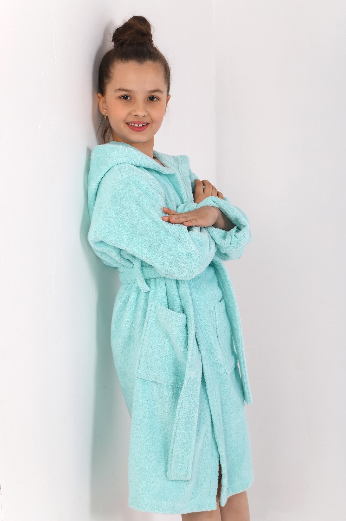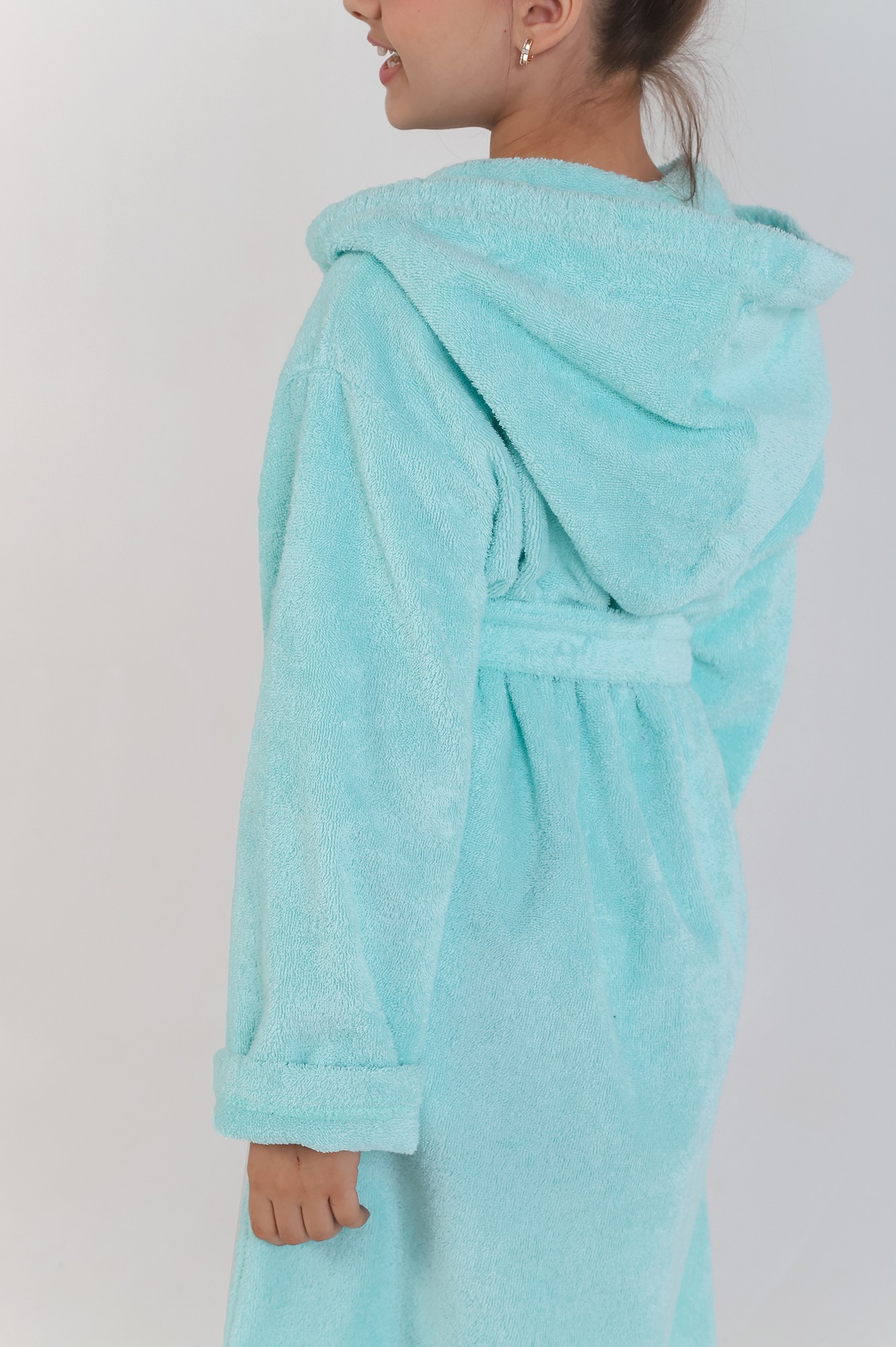Халат для девочки из двустороннего махрового хлопкового полотна. Модель на запах, с капюшоном, с поясом в шлёвках с петлей-вешалкой по горловине спинки, с боковыми карманами.