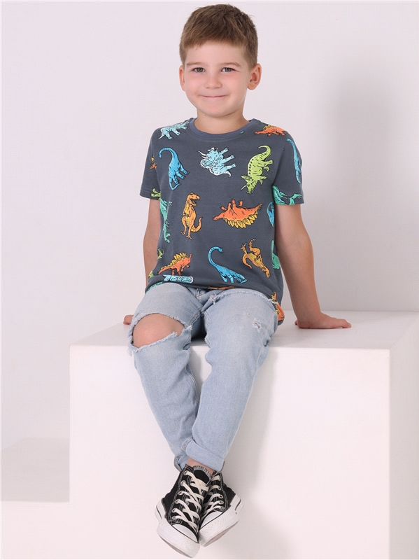 кулир / хлопок 100% - / цветные фигурки динозавров на темно-сером+темно-серый235 / -