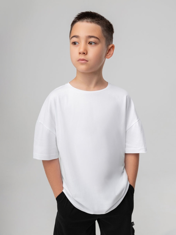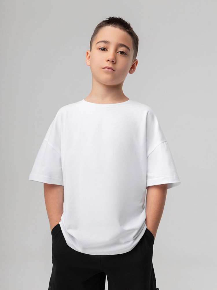 Материал кулирная гладь Состав 92% хлопок 8% лайкра Футболка для детей дошкольного и школьного возраста. Детали: короткий спущенный рукав, свободный покрой, округлый вырез горловины. Идеальный вариант для детского сада, на прогулку, для занятий спортом, либо как домашняя одежда. Состав: кулирная гладь 92% хлопок 8% лайкра