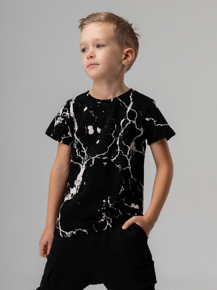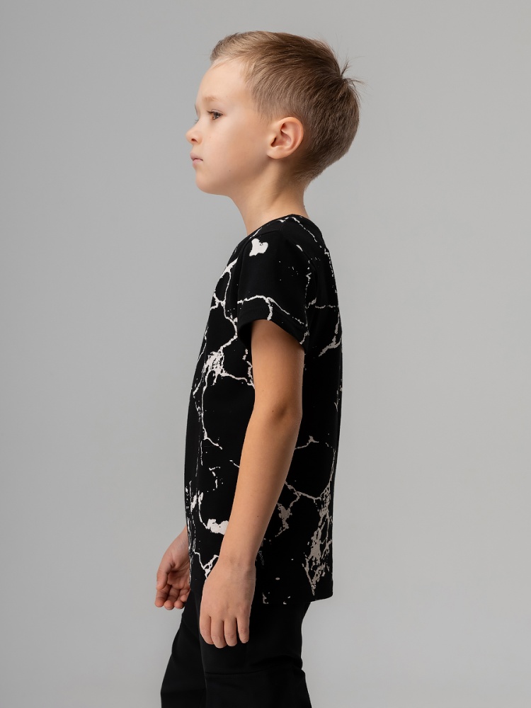 Материал кулирная гладь Состав 92% хлопок 8% лайкра Футболка для детей дошкольного возраста. Футболка свободного силуэта с втачным коротким рукавом. Горловина футболки округлой формы. Состав: кулирная гладь 92% хлопок 8% лайкра.