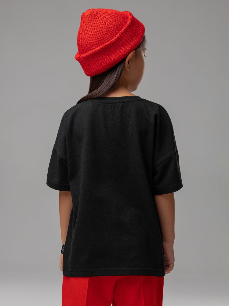 Материал кулирная гладь Состав 92% хлопок 8% лайкра Футболка для детей дошкольного возраста. Футболка свободного силуэта со спущенным плечом с втачным коротким рукавом. Горловина футболки округлой формы. Состав: кулирная гладь 92% хлопок 8% лайкра