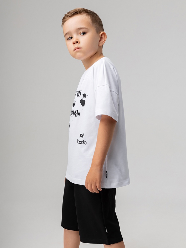 Материал кулирная гладь Состав 92% хлопок 8% лайкра Футболка для детей дошкольного возраста. Футболка свободного силуэта со спущенным плечом с втачным коротким рукавом. Горловина футболки округлой формы. Состав: кулирная гладь 92% хлопок 8% лайкра