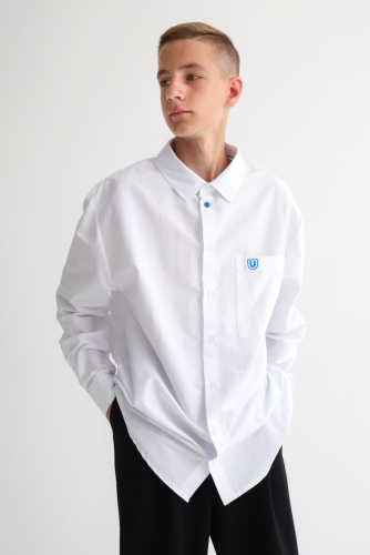 Футболка свободного кроя с контрастной окантовкой горловины из кашкорсе. Разрезы по бокам. Удлиненная спинка. Фирменная нашивка-прищепка в низу изделия.