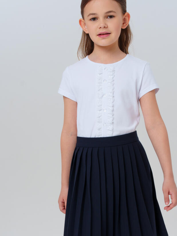 Эта белая школьная блузка для девочки сочетает комфорт футболки и изящество нарядного верха. Модель выполнена из мягкого трикотажа с высоким содержанием хлопка — ткань приятная на ощупь, хорошо пропускает воздух и сохраняет опрятный внешний вид в течение всего дня. Небольшое добавление эластана помогает блузке держать форму и не вытягиваться после стирки.