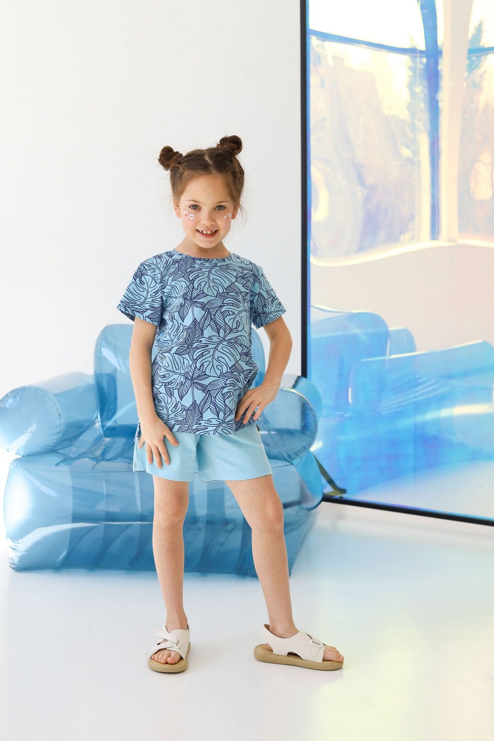 Футболка-фуфайка с разрезами принт Монстера светло-голубой