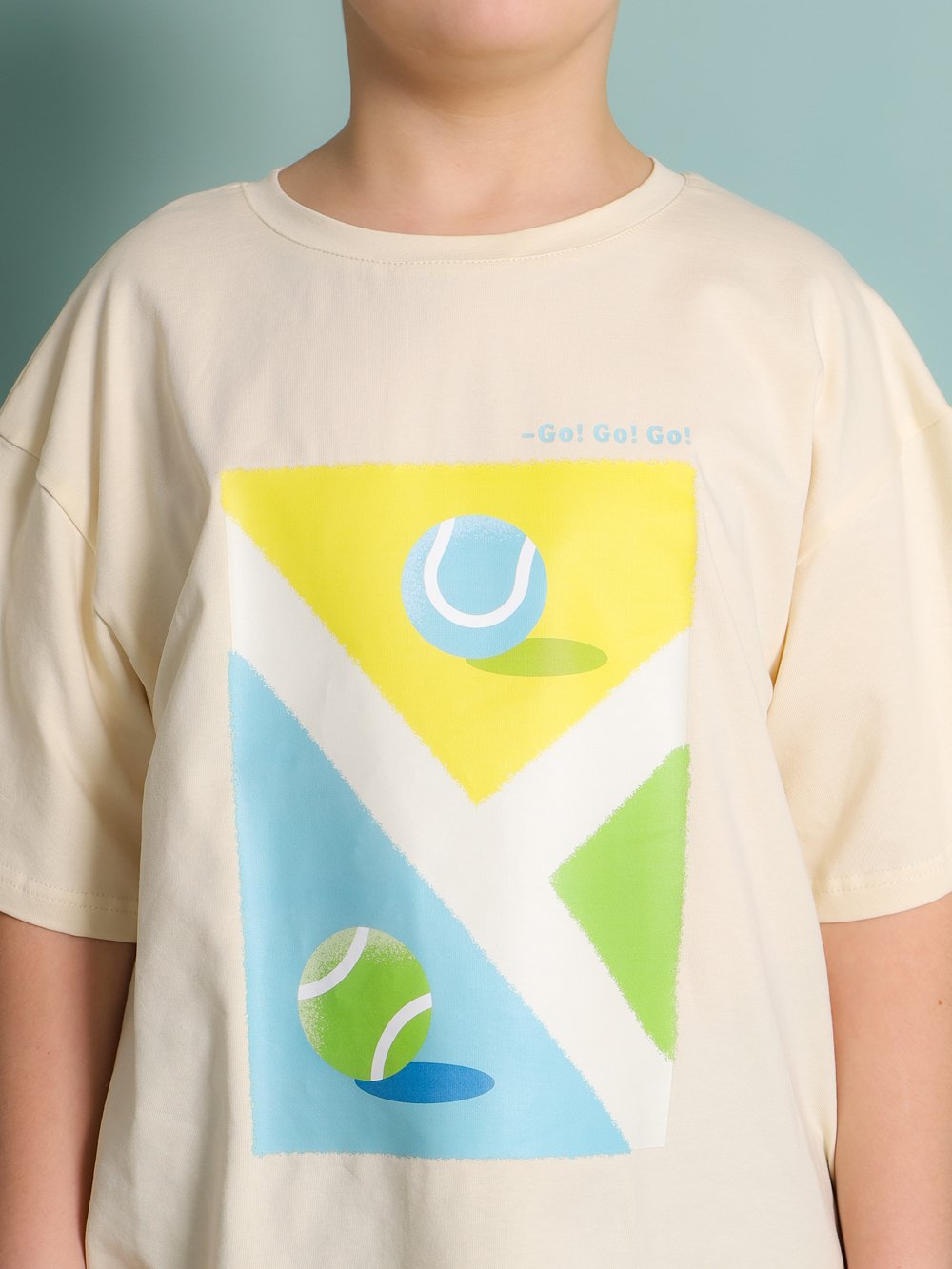 Футболка умеренного объема с округлым вырезом горловины и объемный принтом на полочке.