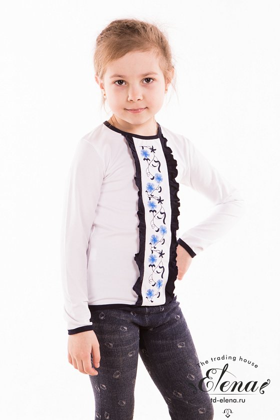 Футболка детская пошита из хлопка с лайкрой однотонной расцветки, с длинными рукавами, вставкой с вышивкой спереди, в качестве отделки обработка бейкой контрастного цвета по горловине, низу рукавов и самому низу изделия, а также рюши у вставки переда.