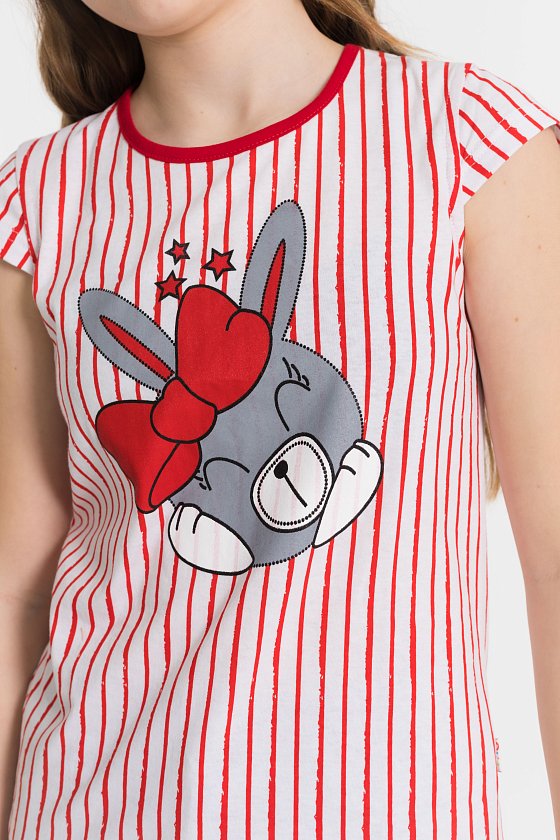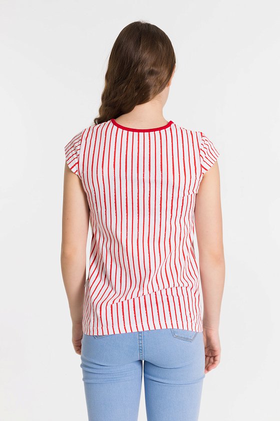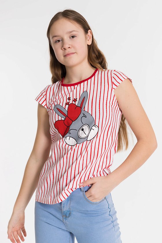 Футболка выполнена из кулирки, 100% хлопок. Овальный вырез горловины обработан бейкой. Спереди нанесён принт.