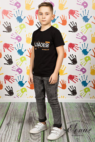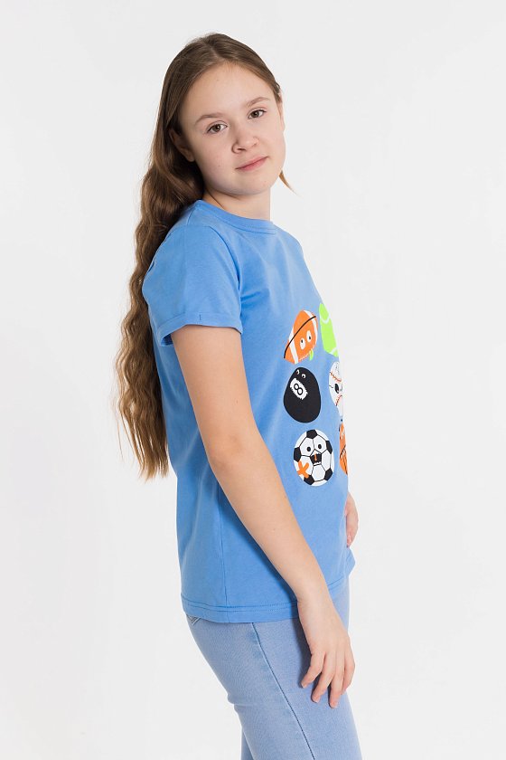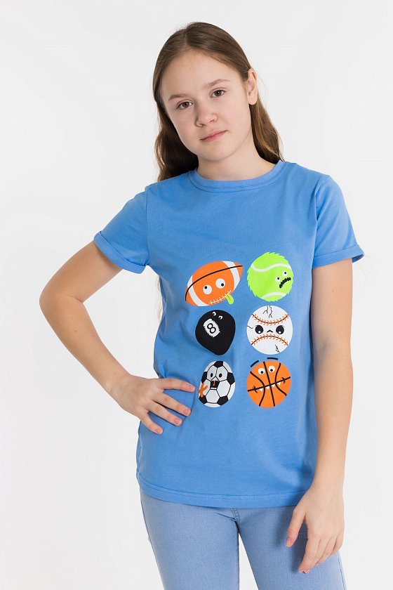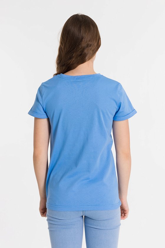 Футболка выполнена из однотонной кулирки, 100% хлопок. Горловина округлая, обработана притачной планкой. Рукав короткий, втачной, с отложной манжетой. Спереди нанесён принт.