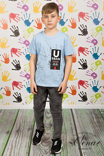 Футболка выполнена из однотонной кулирки, 100% хлопок. Горловина округлая, обработана притачной планкой. Рукав короткий, втачной, с отложной манжетой. Спереди нанесён принт.