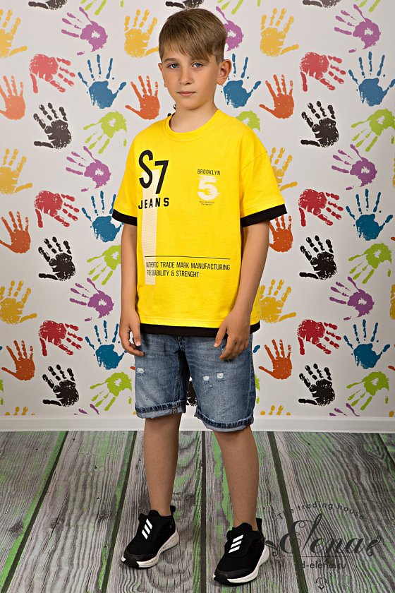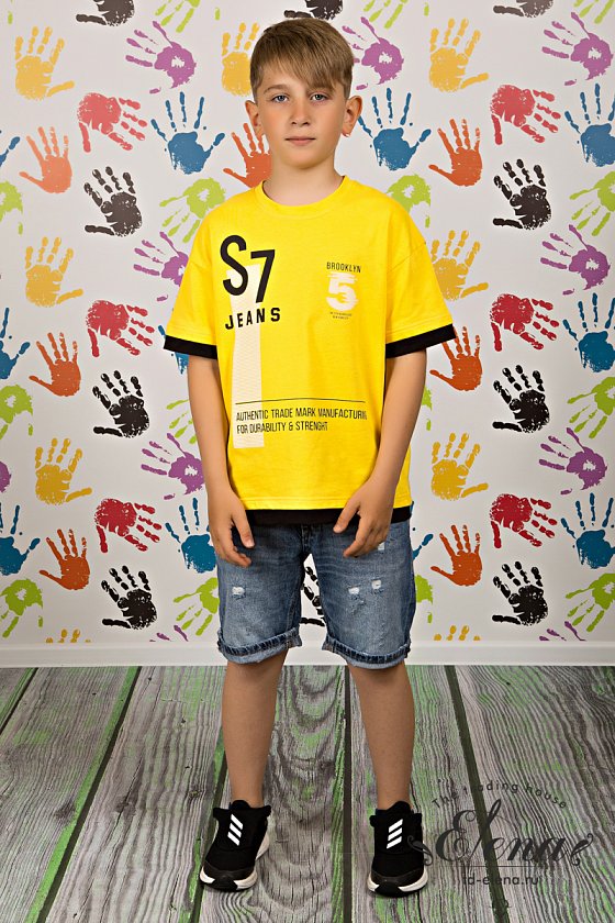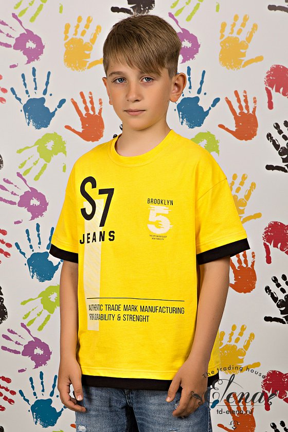 Футболка выполнена из кулирки,100% хлопок с отделкой планками контрастного цвета. Со спущенным рукавом и круглым вырезом горловины. Спереди нанесён принт.